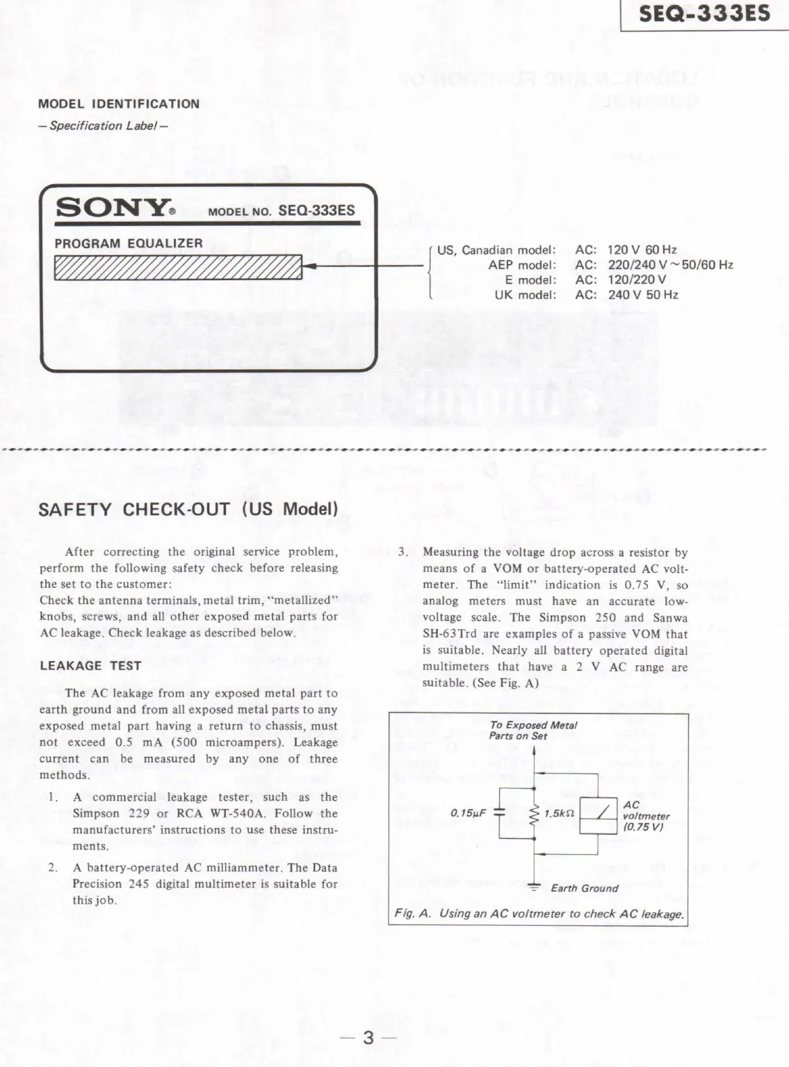 Sony SEQ-333ES - MODEL IDENTIFICATION; Specification Label; SAFETY CHECK-OUT (US Model); Leakage Test
