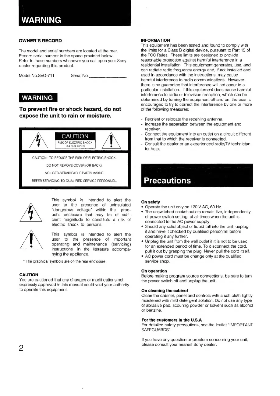 Sony SEQ-711 - WARNING; OWNERS RECORD; Precautions