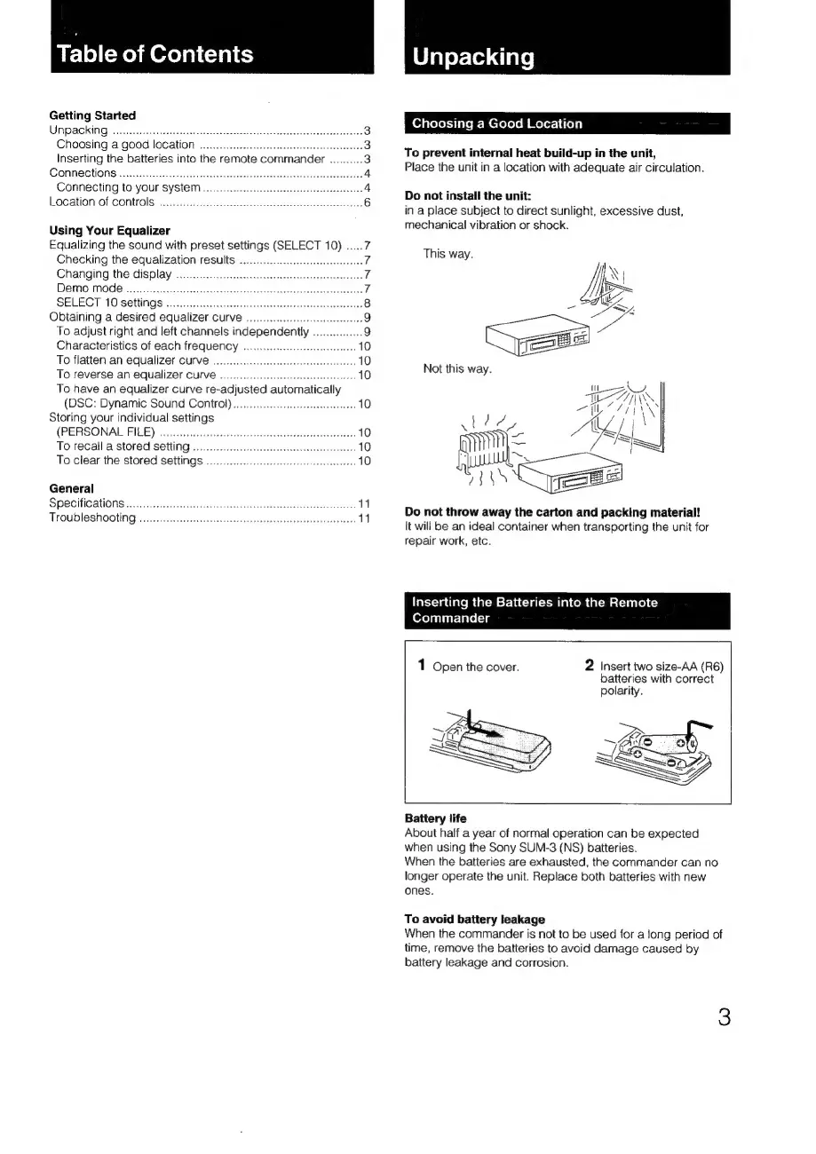 Sony SEQ-711 - Table of Contents; Inserting the Batteries into the Remote Commander