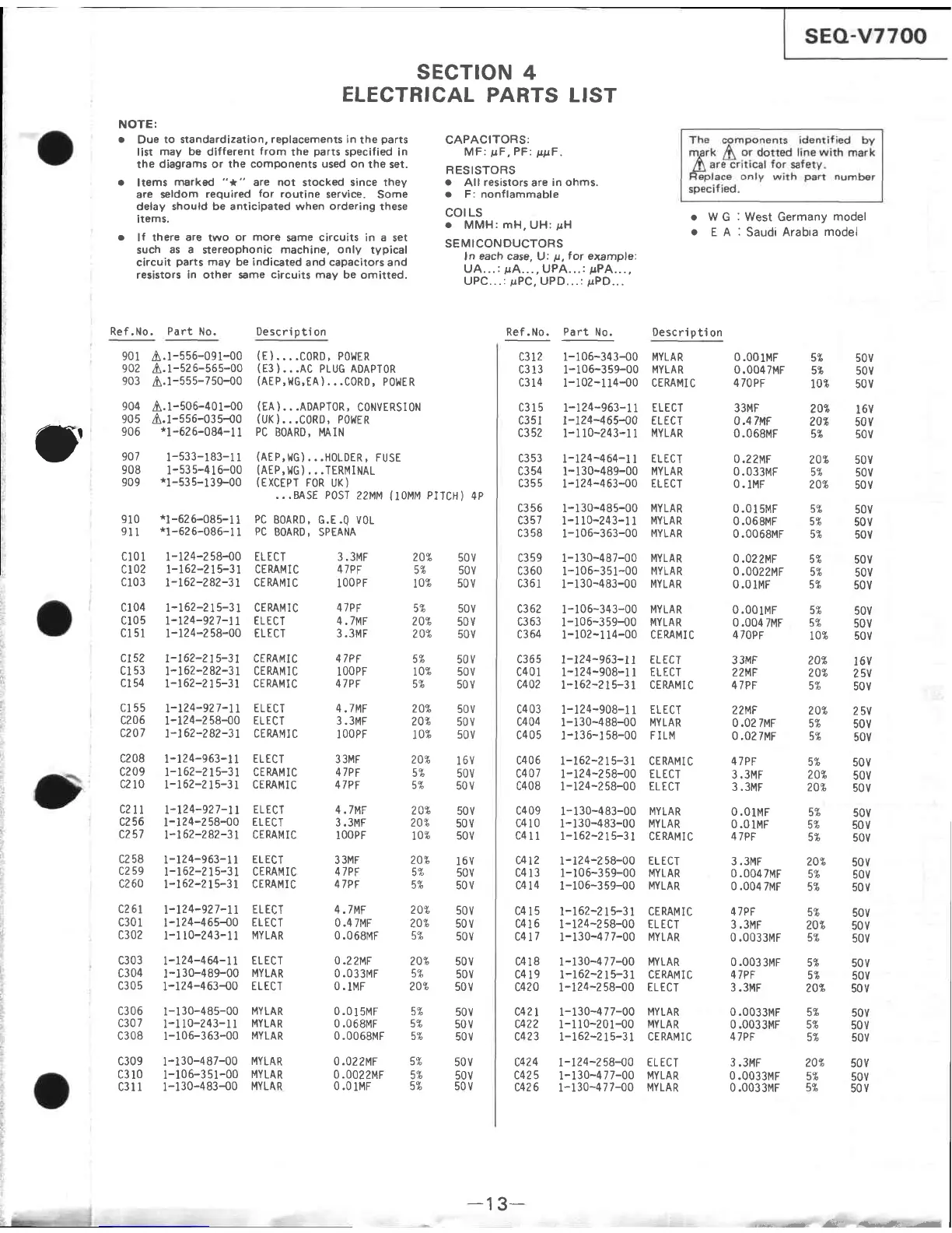 Sony SEQ-V7700 - Electrical Parts List: Capacitors and Coils; Capacitor and Coil Specifications