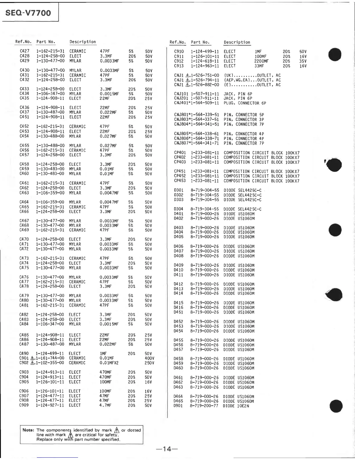 Sony SEQ-V7700 - Electrical Parts List: Semiconductors and Connectors; Semiconductor and Connector Specifications