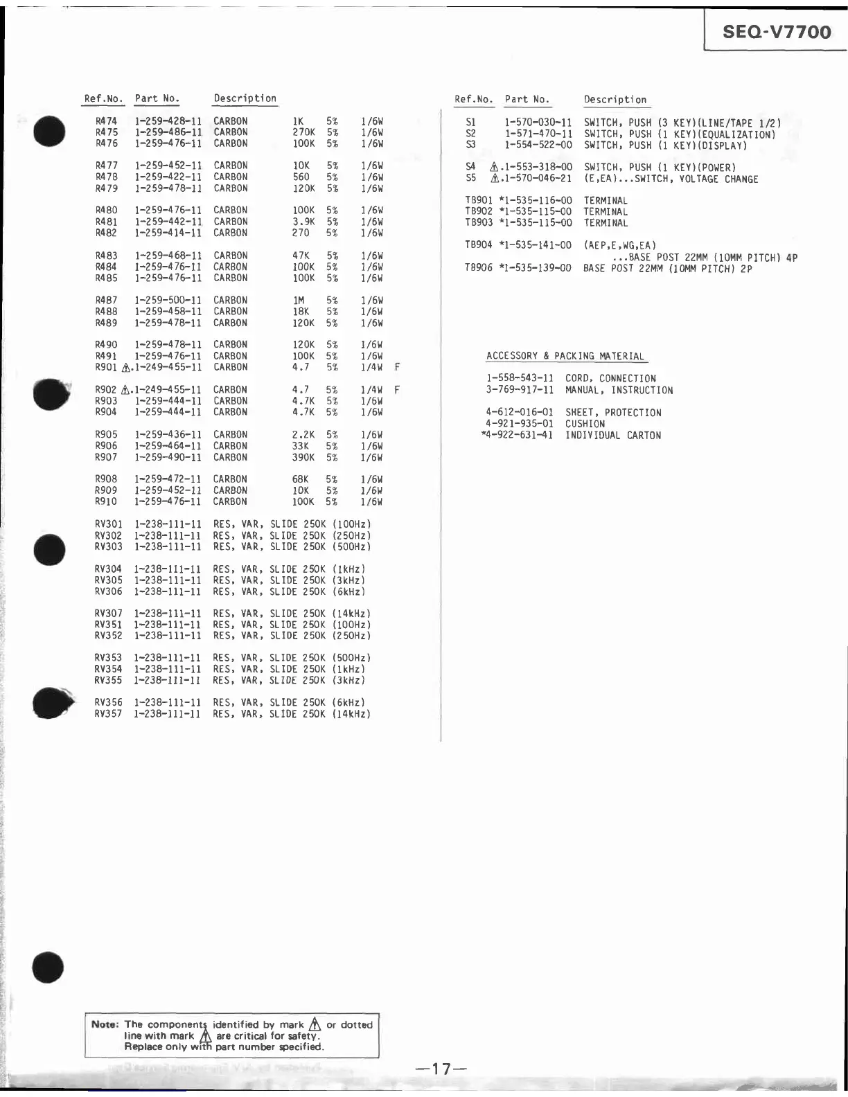 Sony SEQ-V7700 - Electrical Parts List: Switches, Terminals, and Accessories; Switch, Terminal, and Accessory Specifications