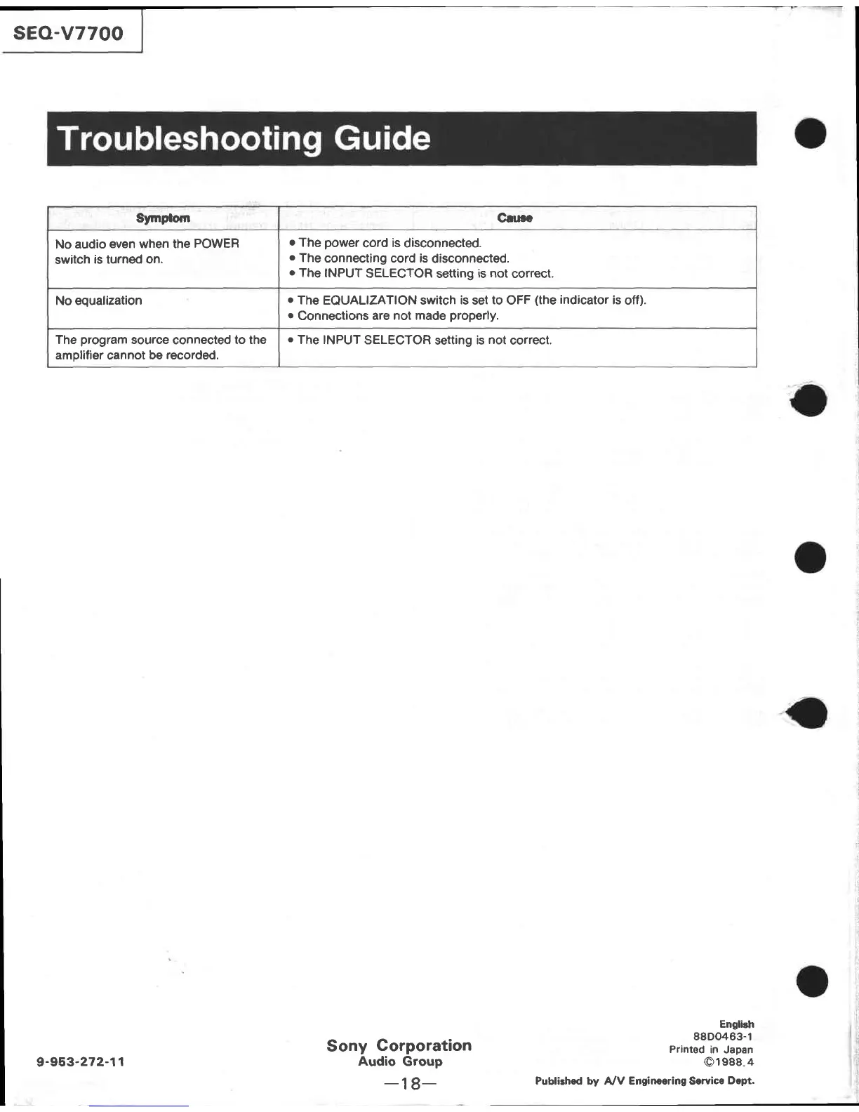 Sony SEQ-V7700 - Troubleshooting Guide; Common Symptoms and Causes