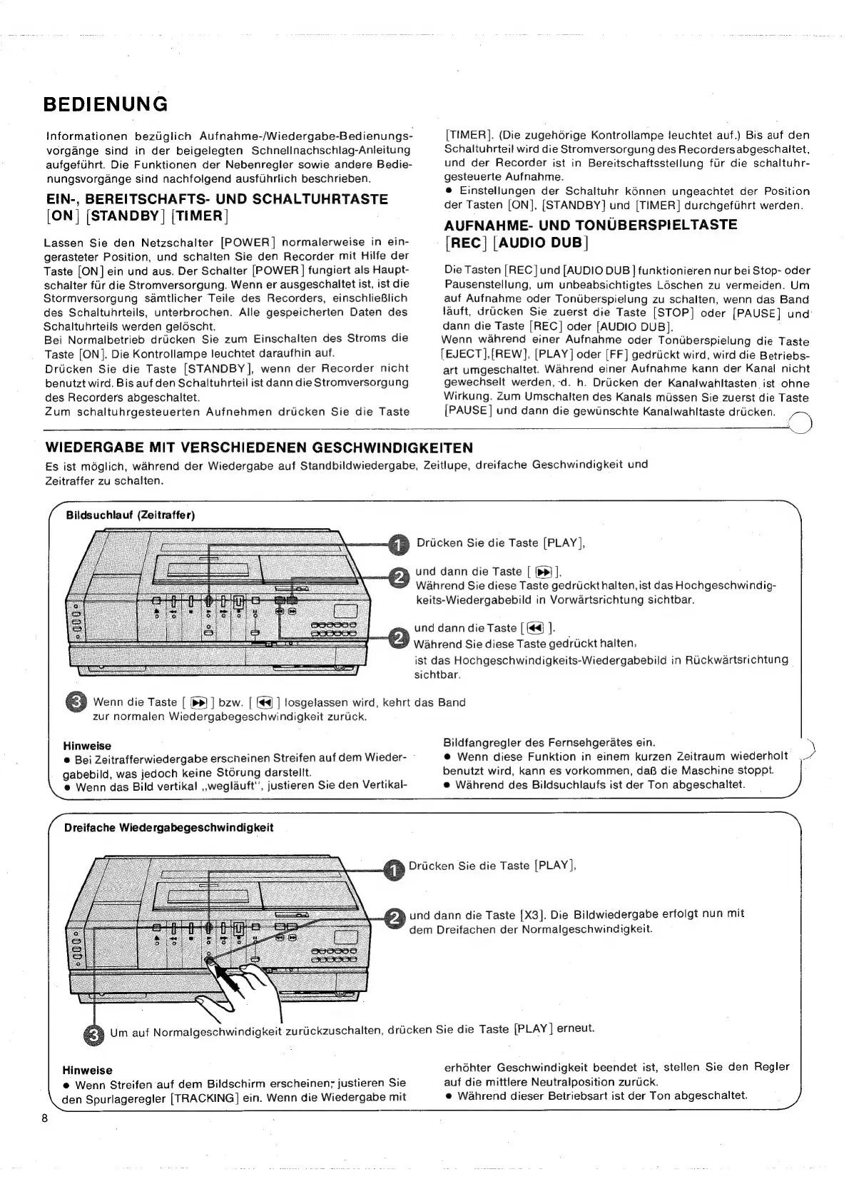 Sony SL-C7E - Ein-, Bereitschafts- und Schaltuhrtaste; Aufnahme- und Tontberspieltaste; Wiedergabe mit Verschiedenen Geschwindigkeiten