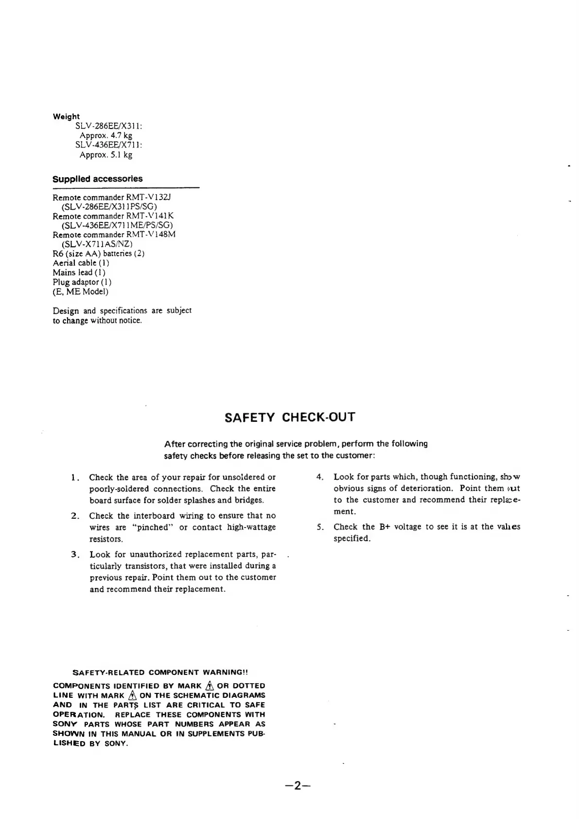 Sony SLV-286EE - Supplied Accessories; Safety Check-Out