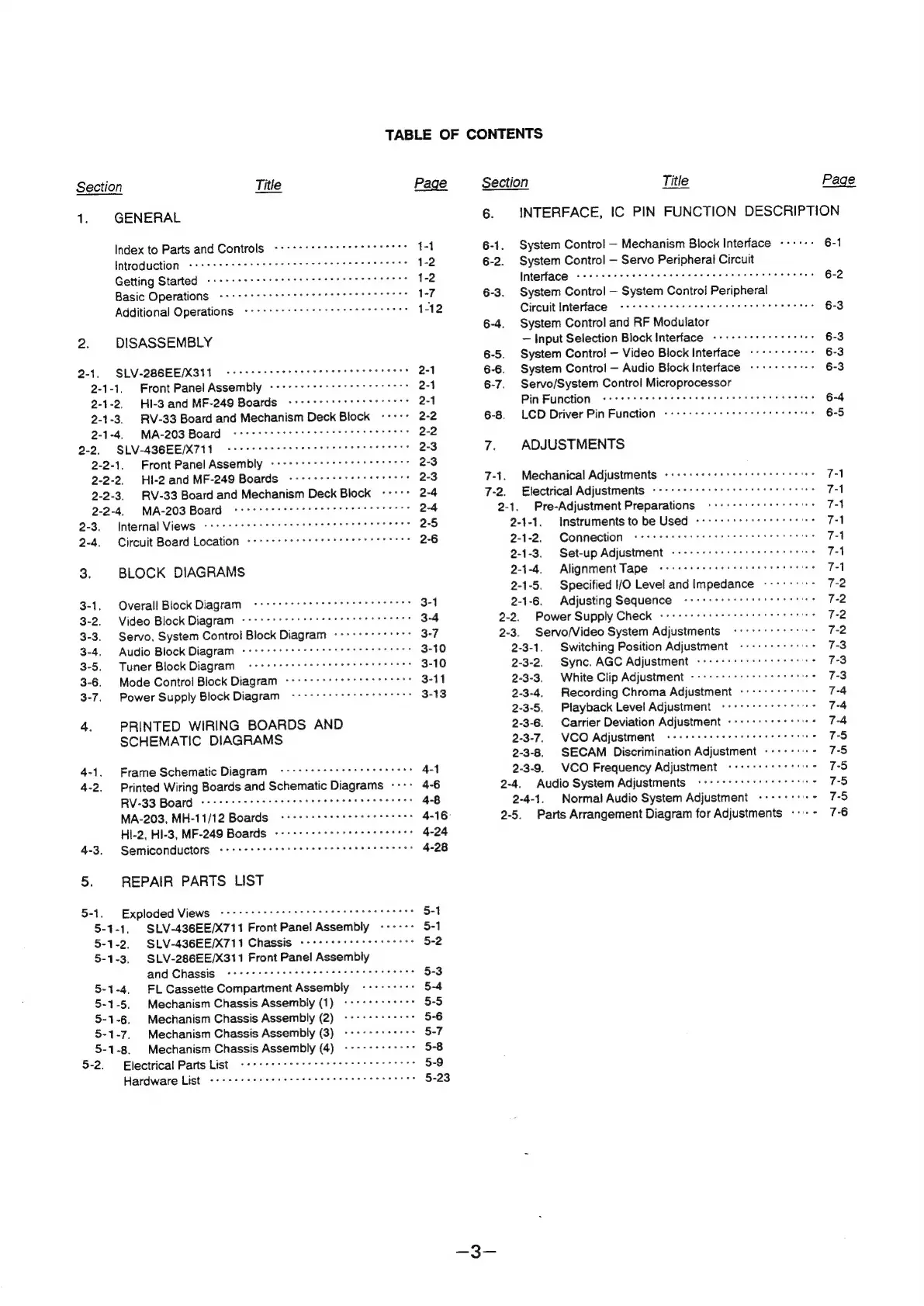 Sony SLV-286EE - Table of Contents