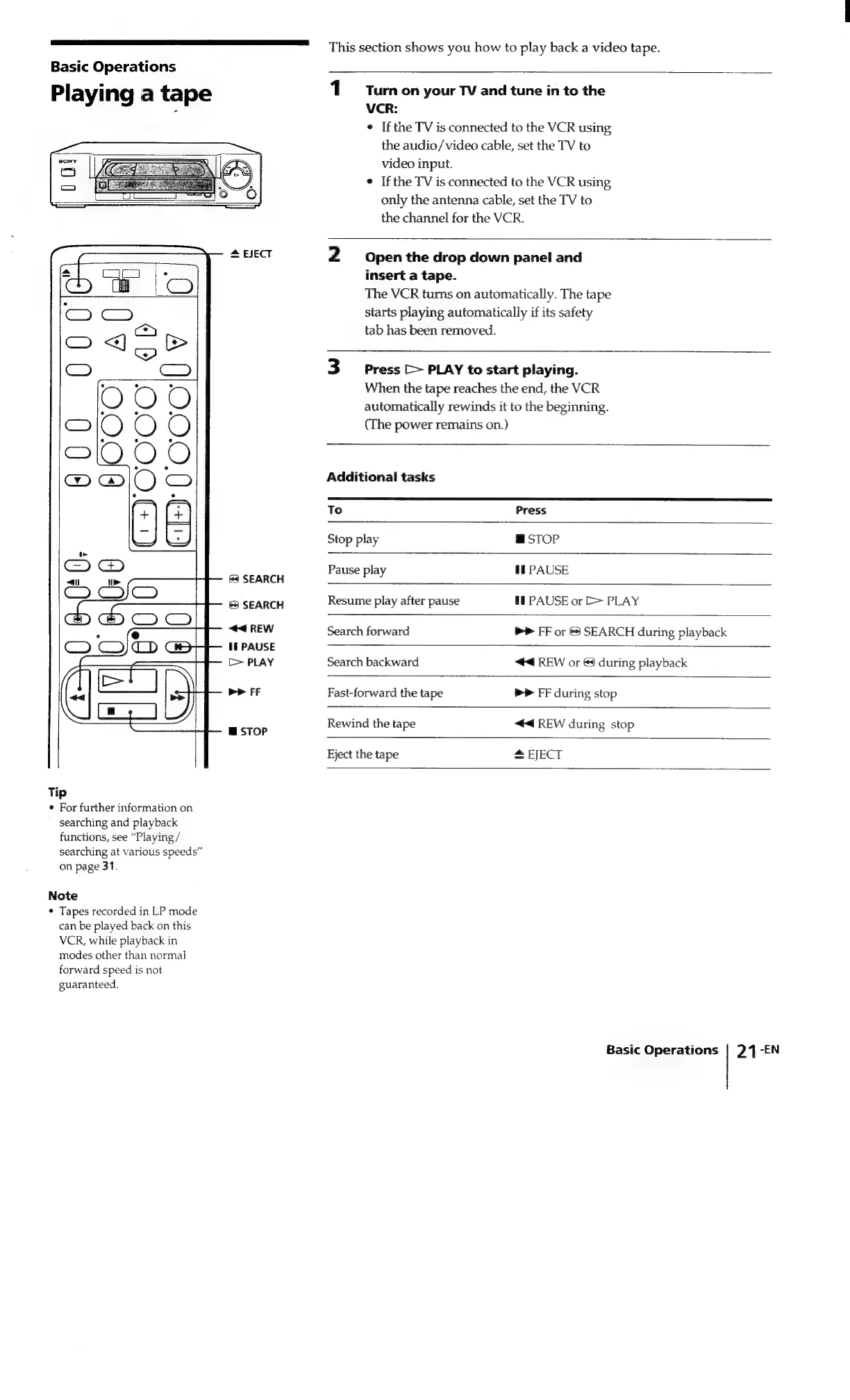 Sony SLV-340 - Basic Operations; Playing a Tape