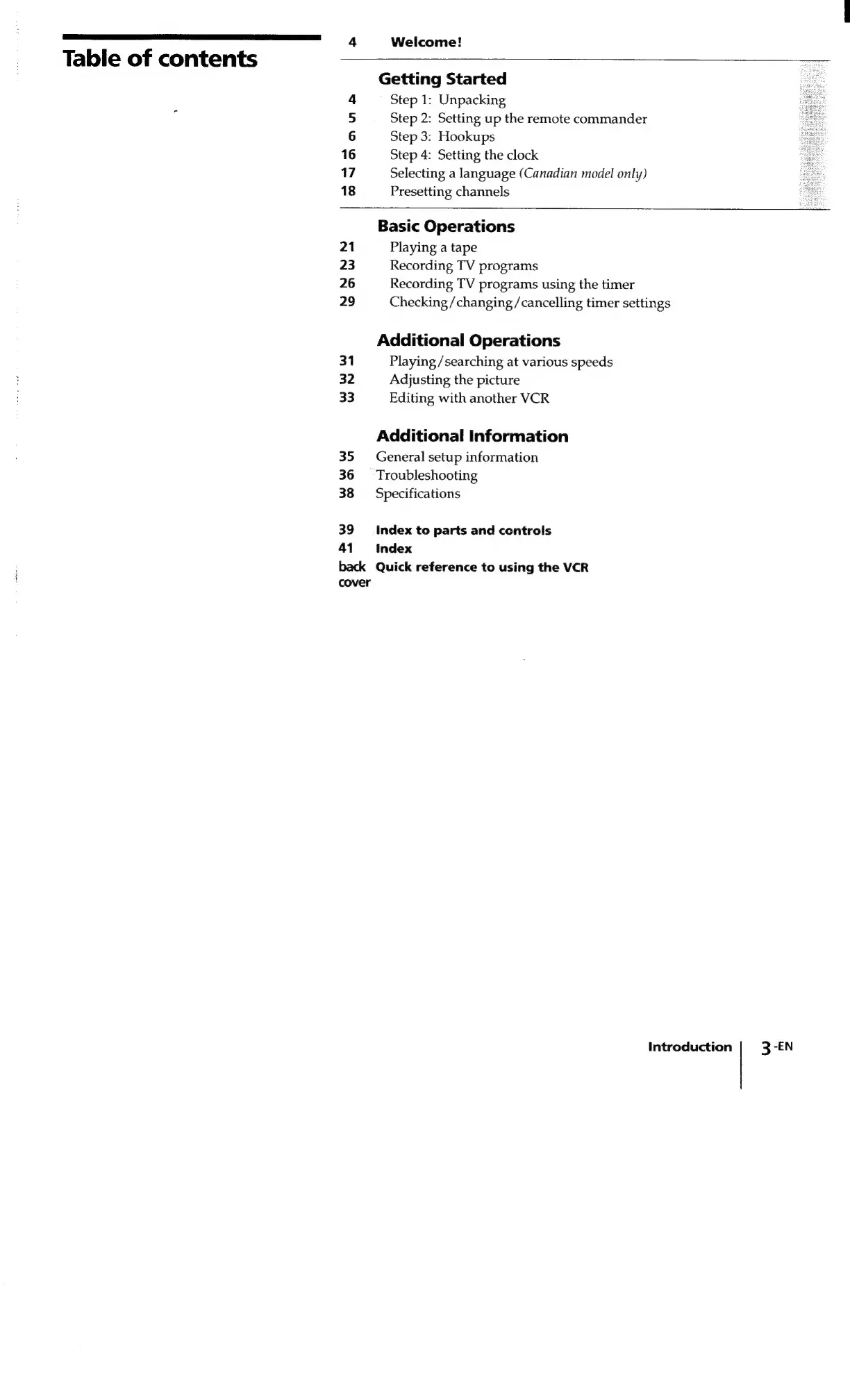 Sony SLV-340 - Table of Contents