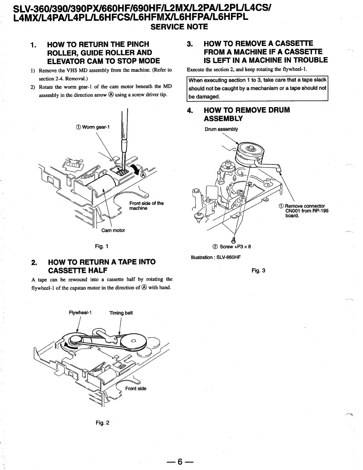 Sony SLV-360 - Service Note; Howto Return the Pinch Roller, Guide Roller and Elevator Cam to Stop Mode; Howto Return a Tape into Cassette Half; How to Remove a Cassette.from