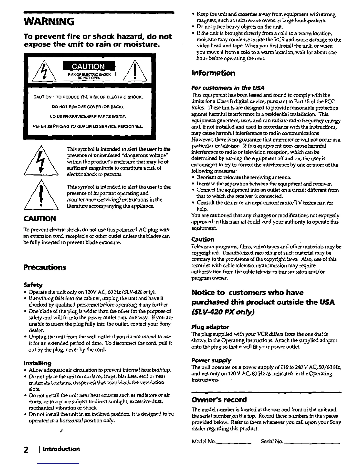 Sony SLV-420 - Warning; Caution; Precautions; Safety