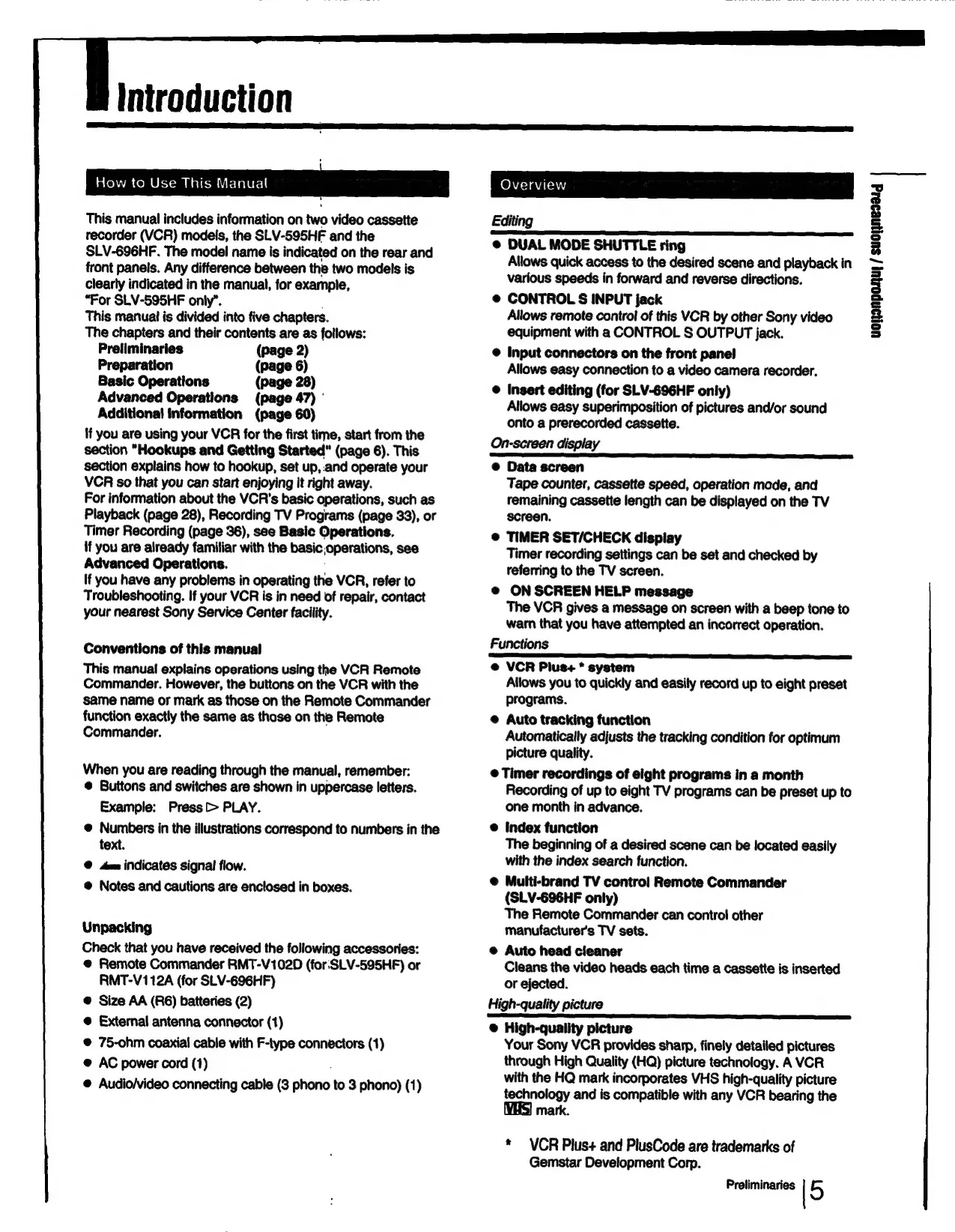 Sony SLV-696HF - Introduction; Navigating the Manual; VCR Features Overview; Manual Conventions and Symbols