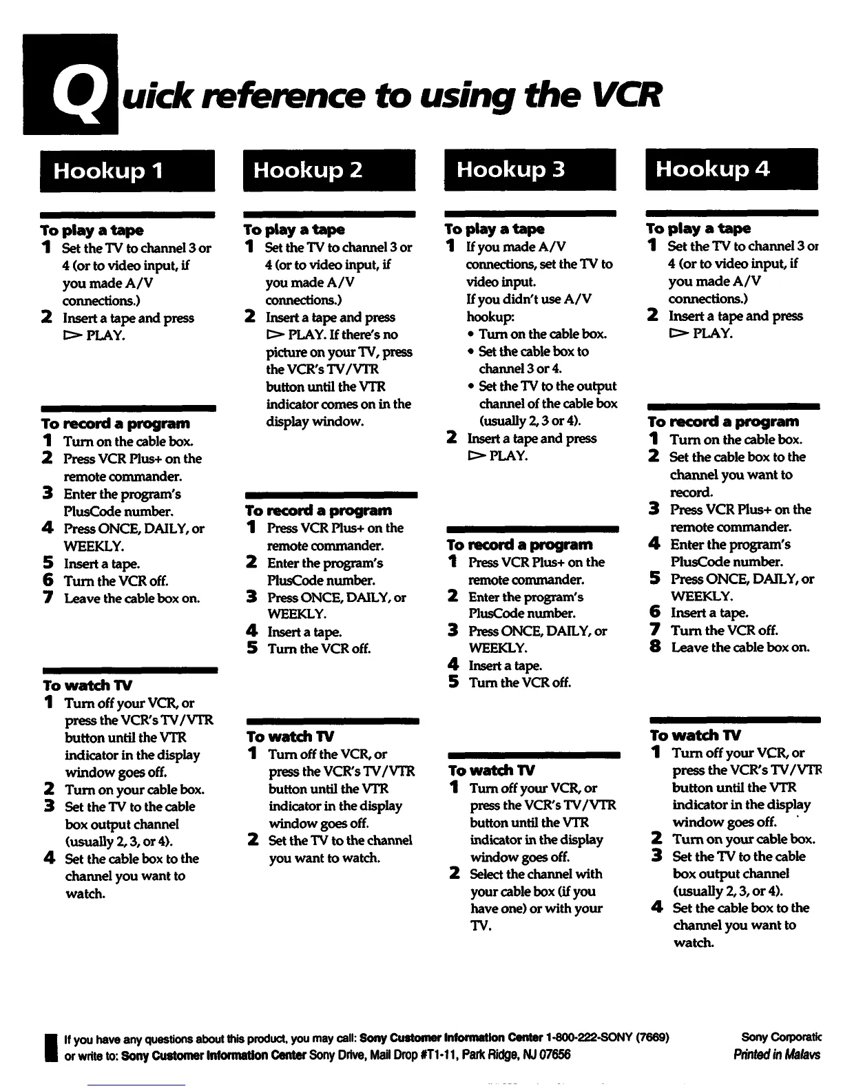 Sony SLV-770HF - Quick Reference to Using the VCR