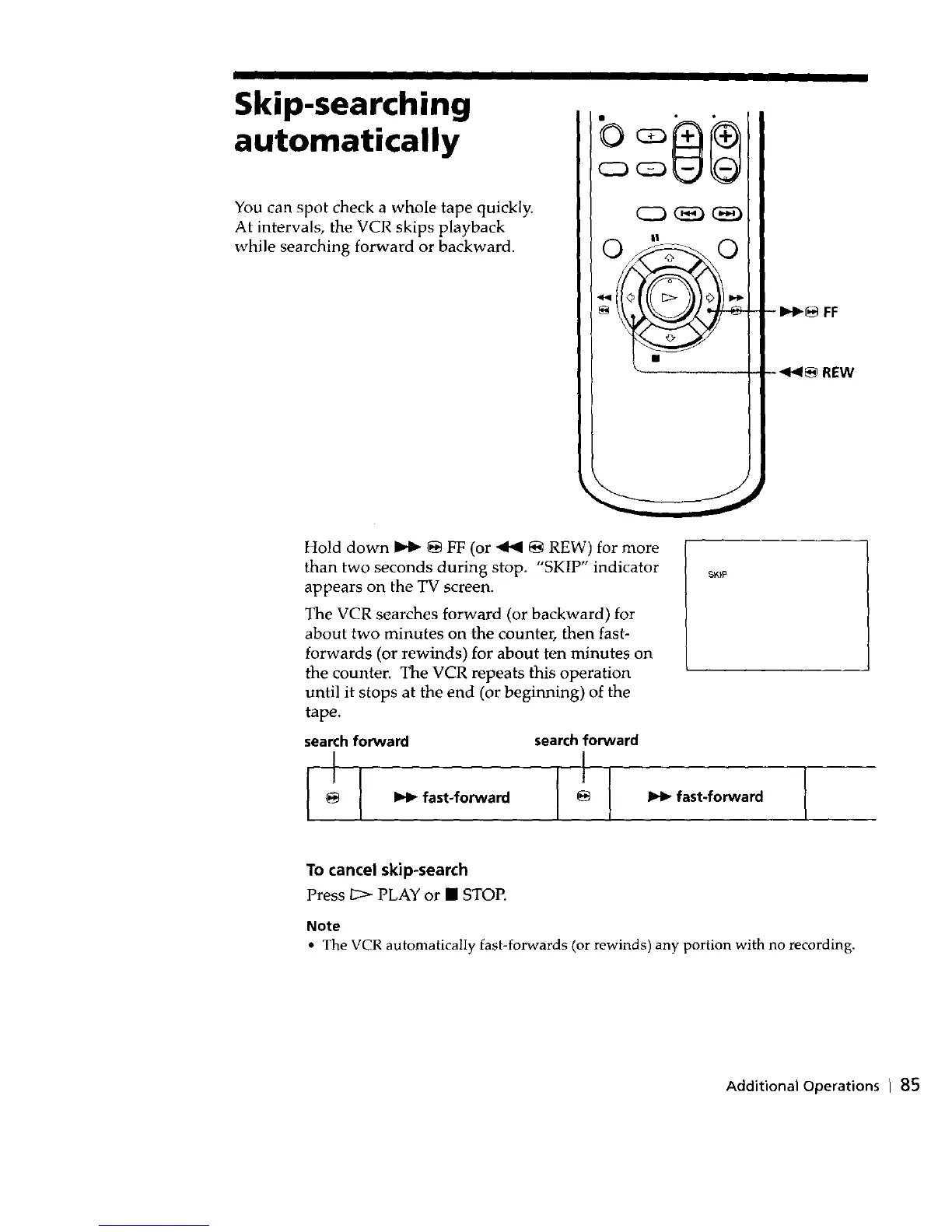 • The VCR automatically fast-forwards (or rewinds) any portion with no recording.