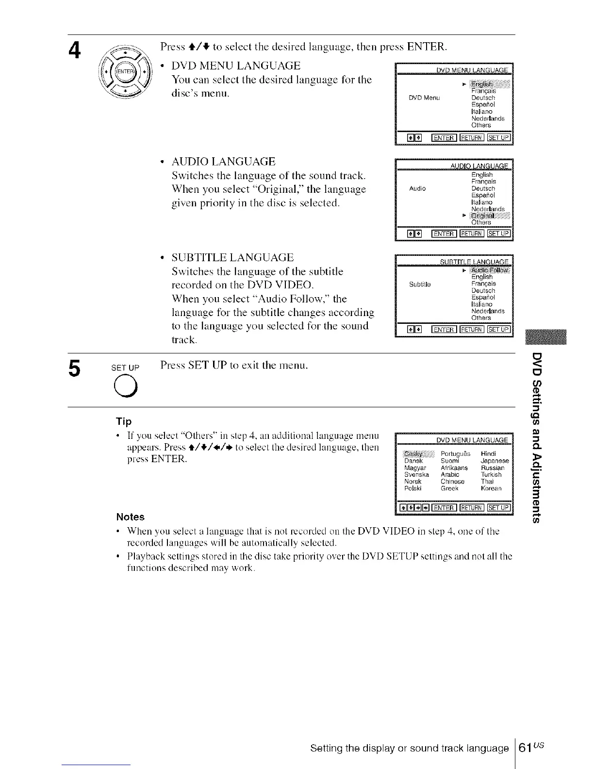 Setting the display or sound track language 61us