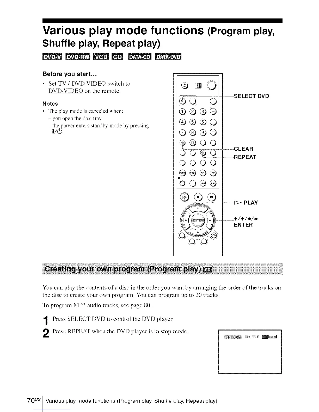 70us Various play mode functions (Program play, Shuffle play, Repeat play)