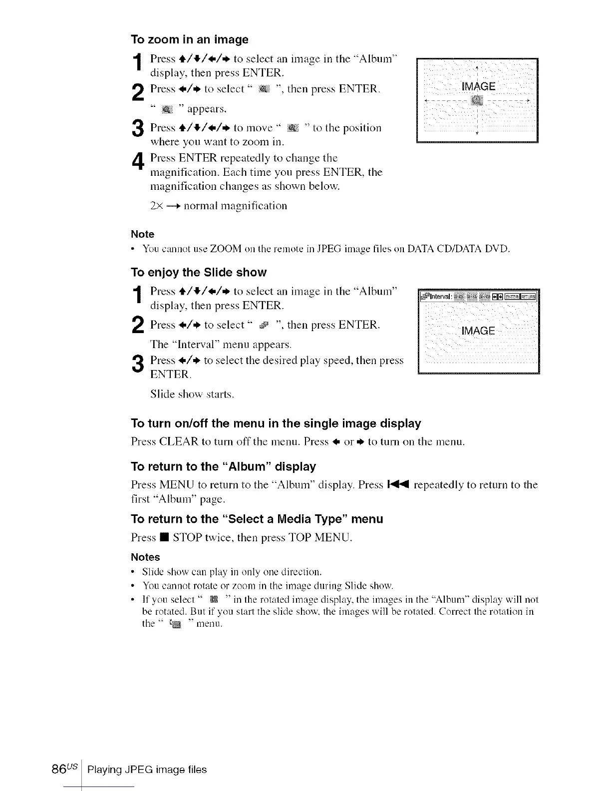 • You cannot use ZOOM on the remote in JPEG image files on DATA CD/DATA DVD.