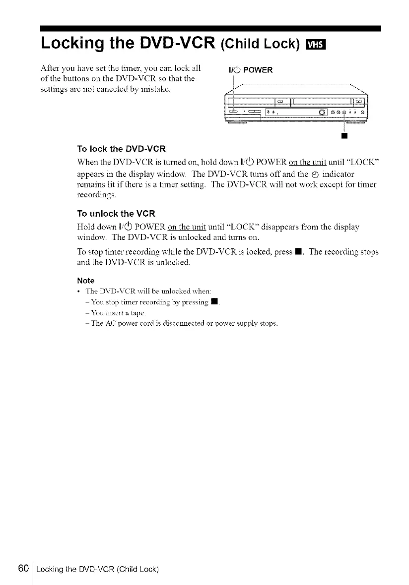 When the DVD-VCR is turned on, hold down I/@ POWER on the unit until "LOCK"