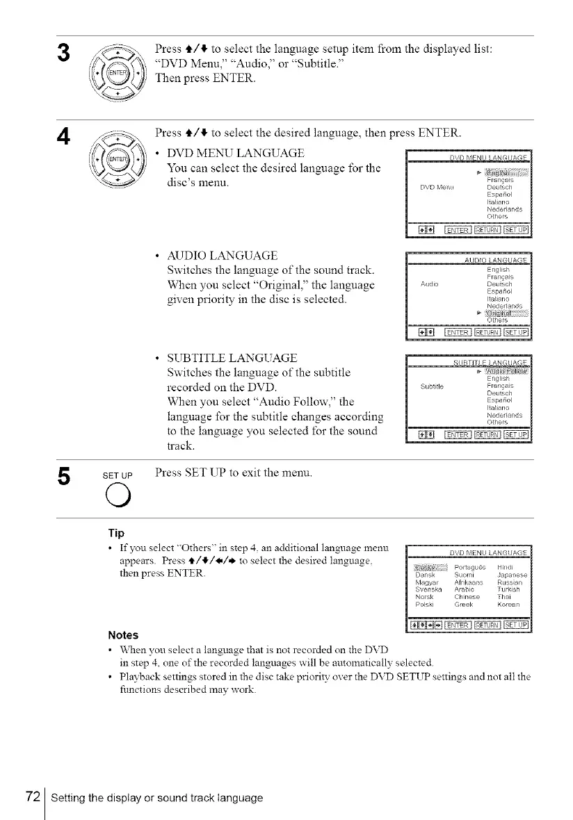 • Playback settings stored in the disc take priority over the DVD SETUP settings and not all the