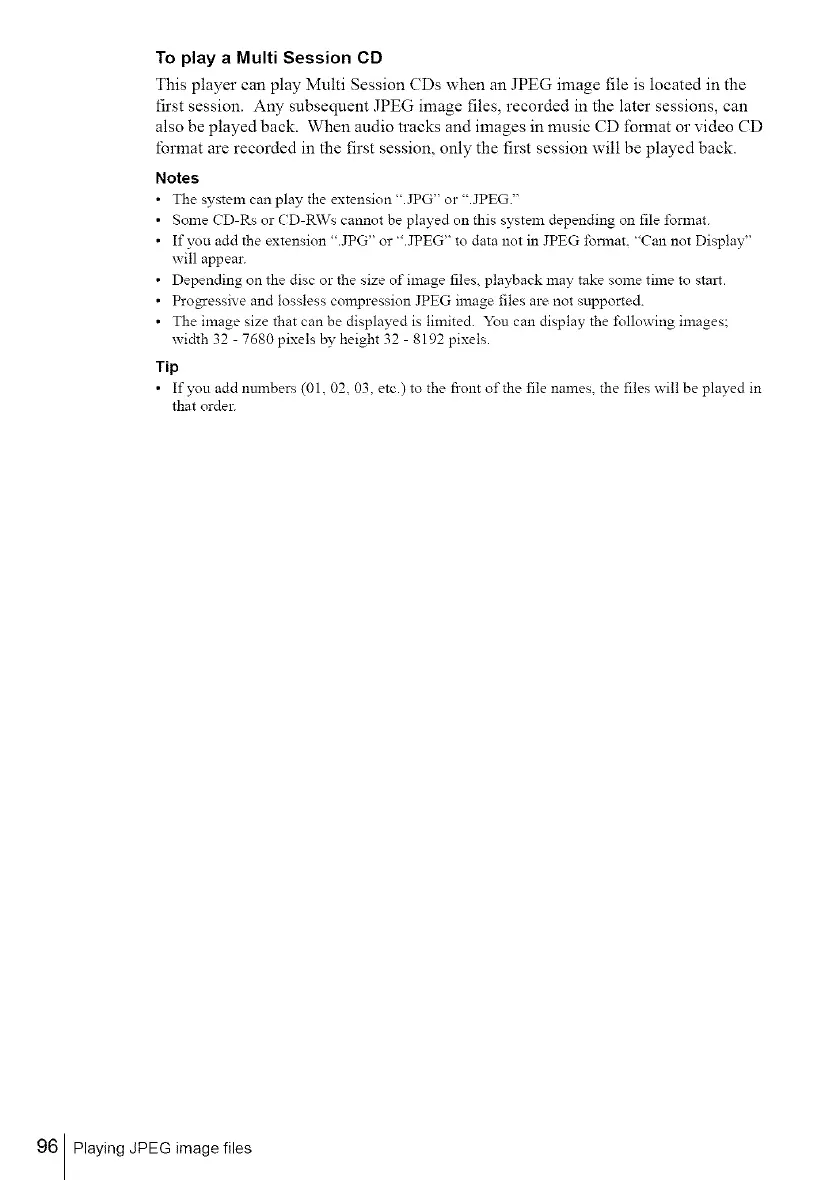 This player can play Multi Session CDs when an JPEG image file is located in the