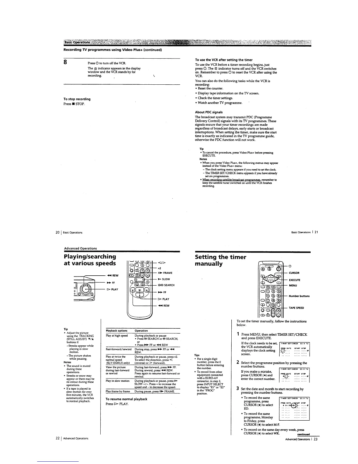 Sony SLV-E120AE - Playing;searching at various speeds; Setting the timer manually