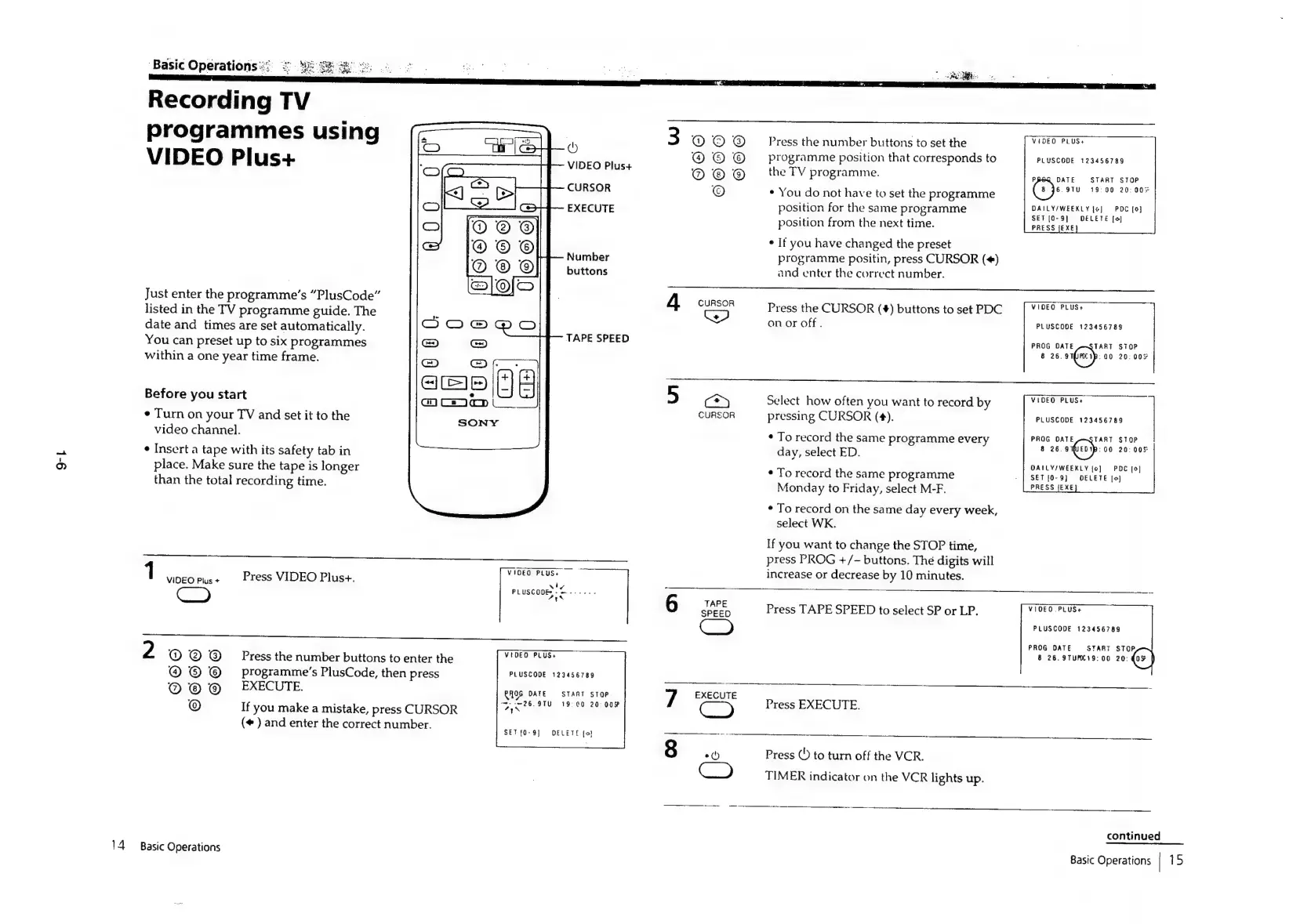 Sony SLV-E205EY - Basic Operations; Recording TV Programmes using VIDEO Plus+