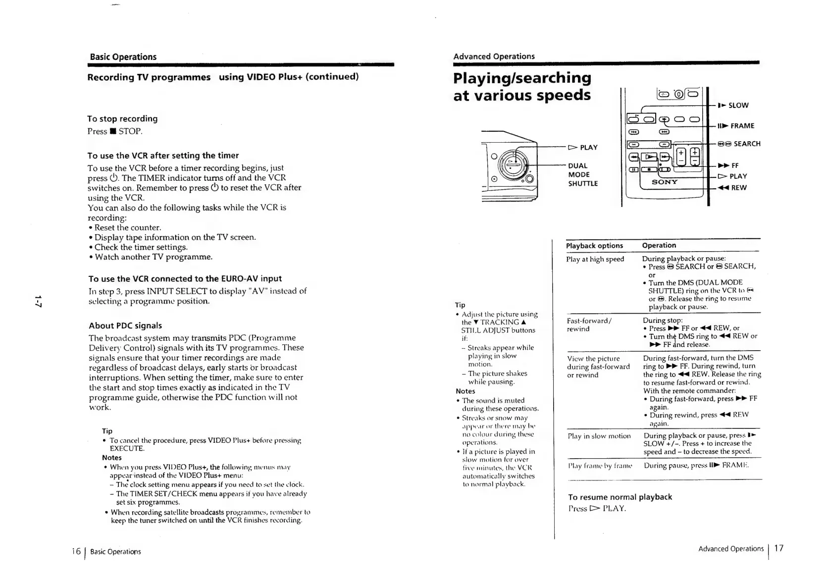 Sony SLV-E205EY - Advanced Operations; Playing;Searching at Various Speeds