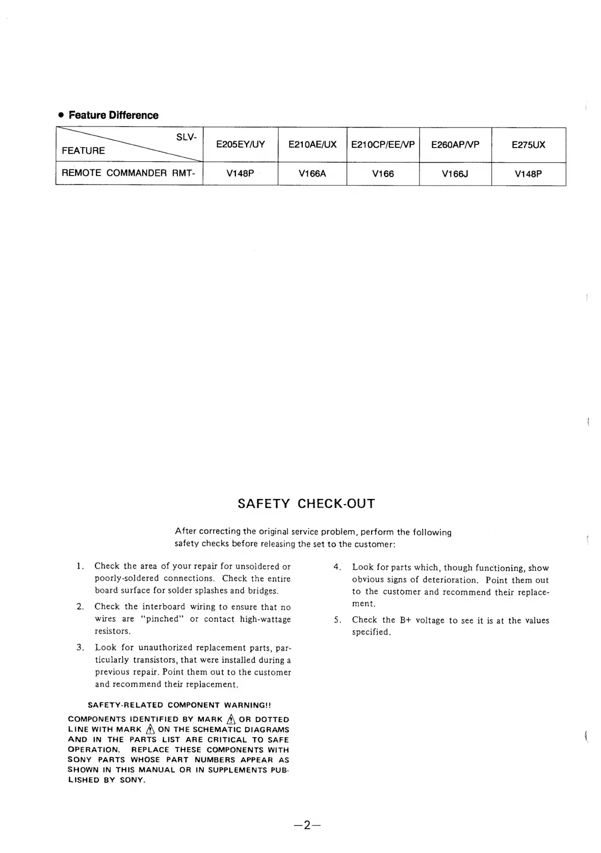 Sony SLV-E205EY - Safety Check-out; Service Safety Checks; Safety-Related Component Warning