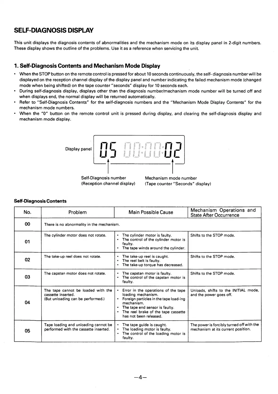 Sony SLV-E205EY - Self-Diagnosis Display; Display Contents and Mechanism Mode; Self-Diagnosis Problem Codes