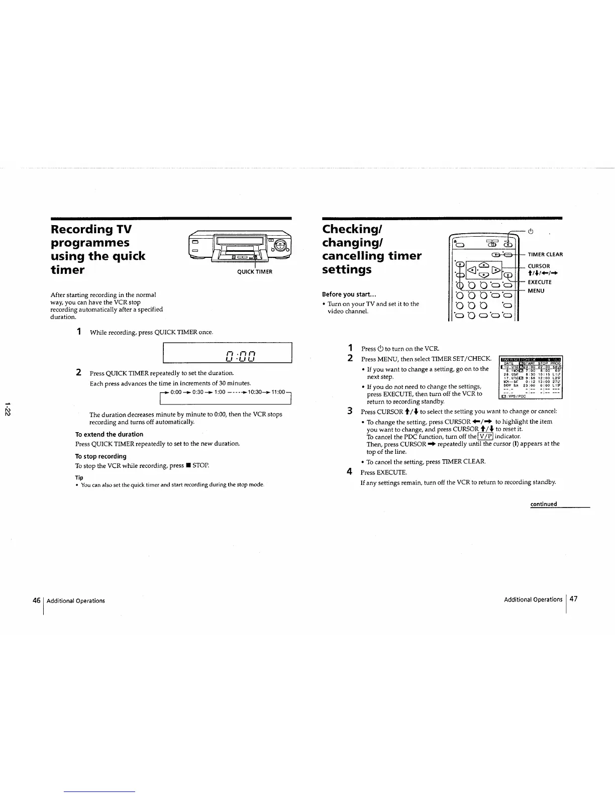Sony SLV-E510EE - Recording TV programmes using the quick timer; Checking;changing;cancelling timer settings
