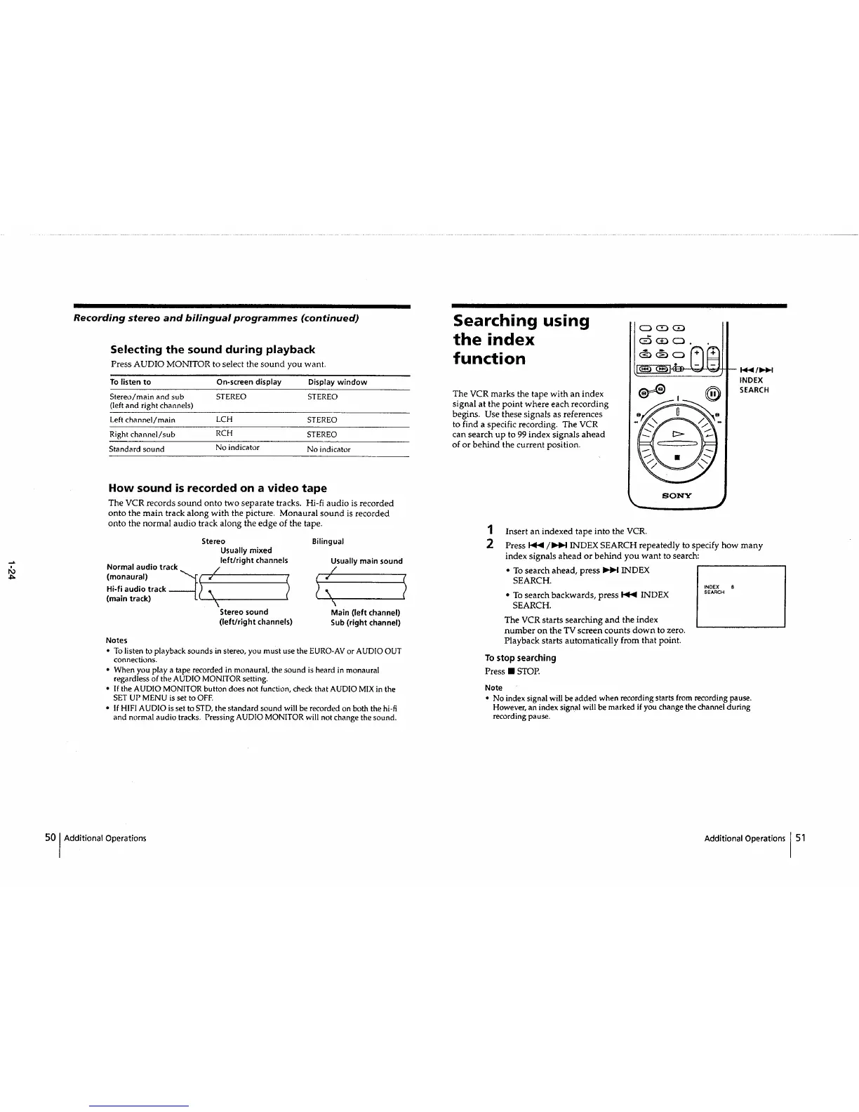 Sony SLV-E510EE - Selecting the sound during playback; Searching using the index function