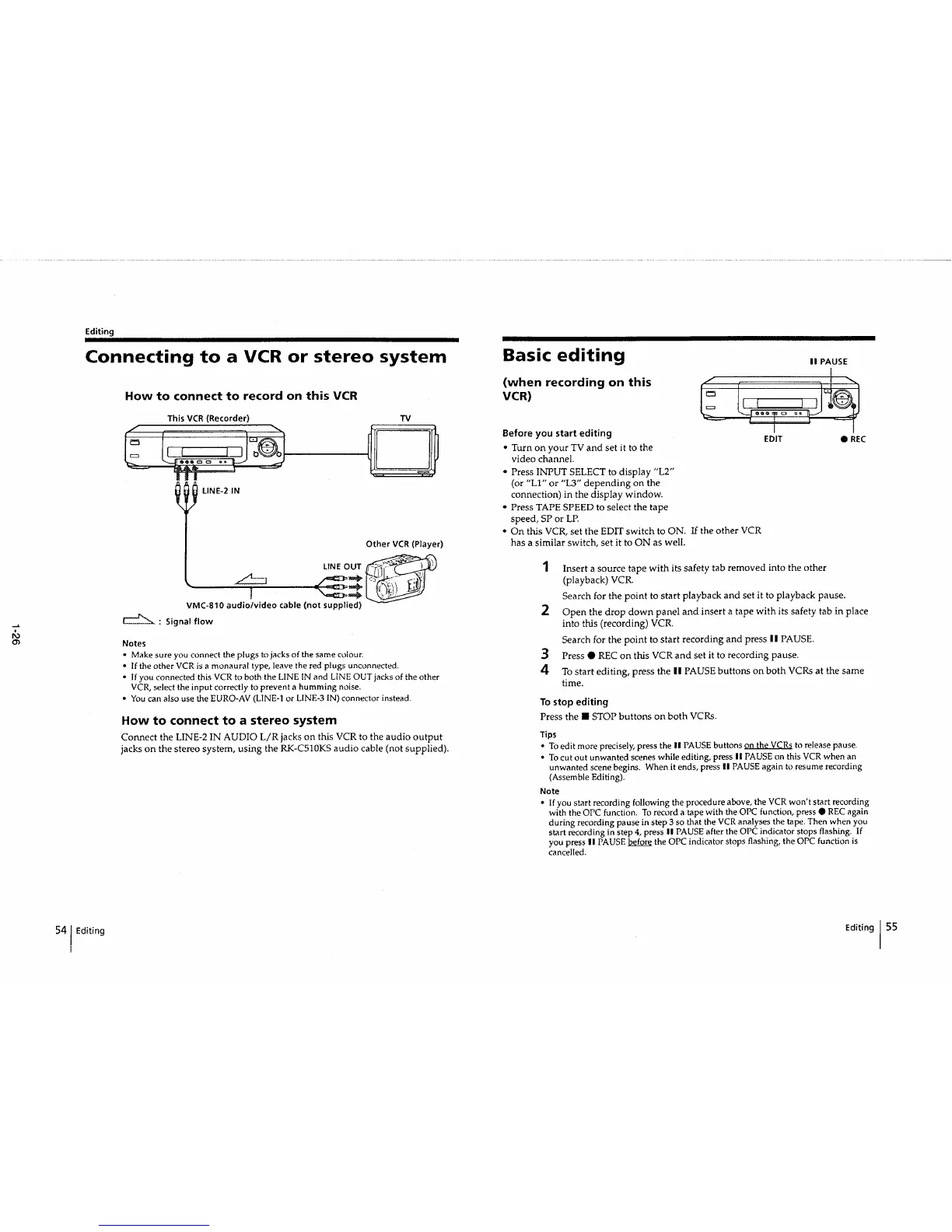 Sony SLV-E510EE - Editing; Connecting to a VCR or stereo system; Basic editing (when recording on this VCR)
