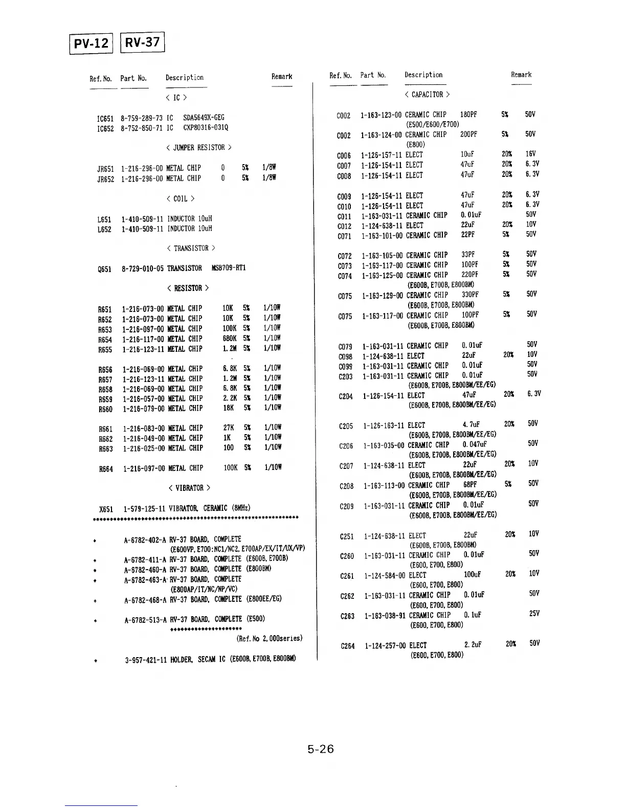 Sony SLV-E700 - Electrical Parts List - PV-12, RV-37 Components; RV-37 Capacitors and Transistors