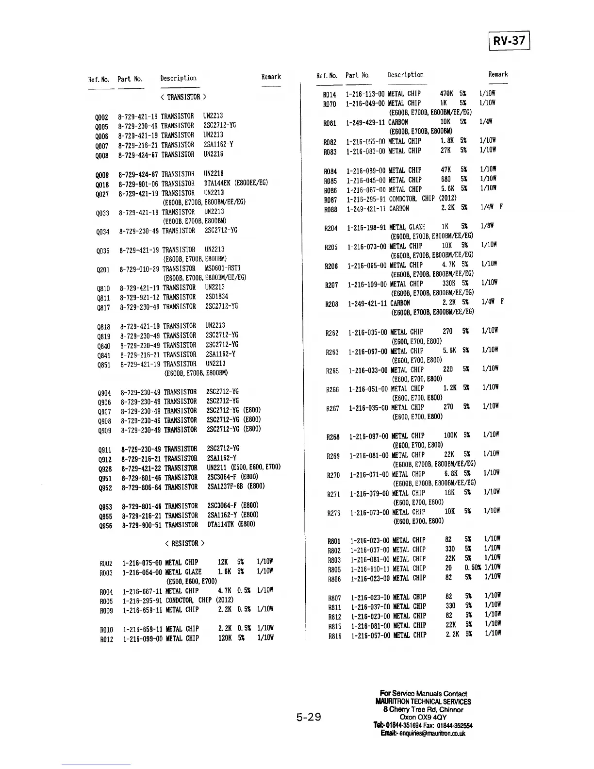 Sony SLV-E700 - Electrical Parts List - RV-37 Components (Transistors, Resistors)