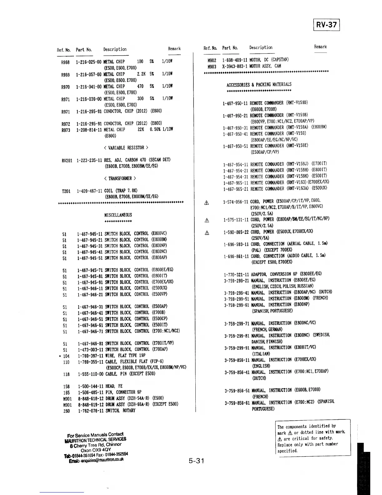 Sony SLV-E700 - Miscellaneous Parts and Hardware List; Miscellaneous Parts; Hardware List