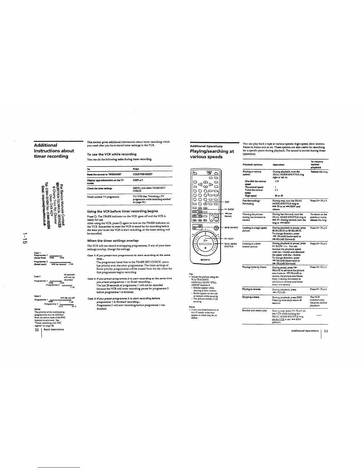 Sony SLV-E800EE - Additional Timer Recording Instructions; VCR Operation During Recording; Pre-Recording Preparation