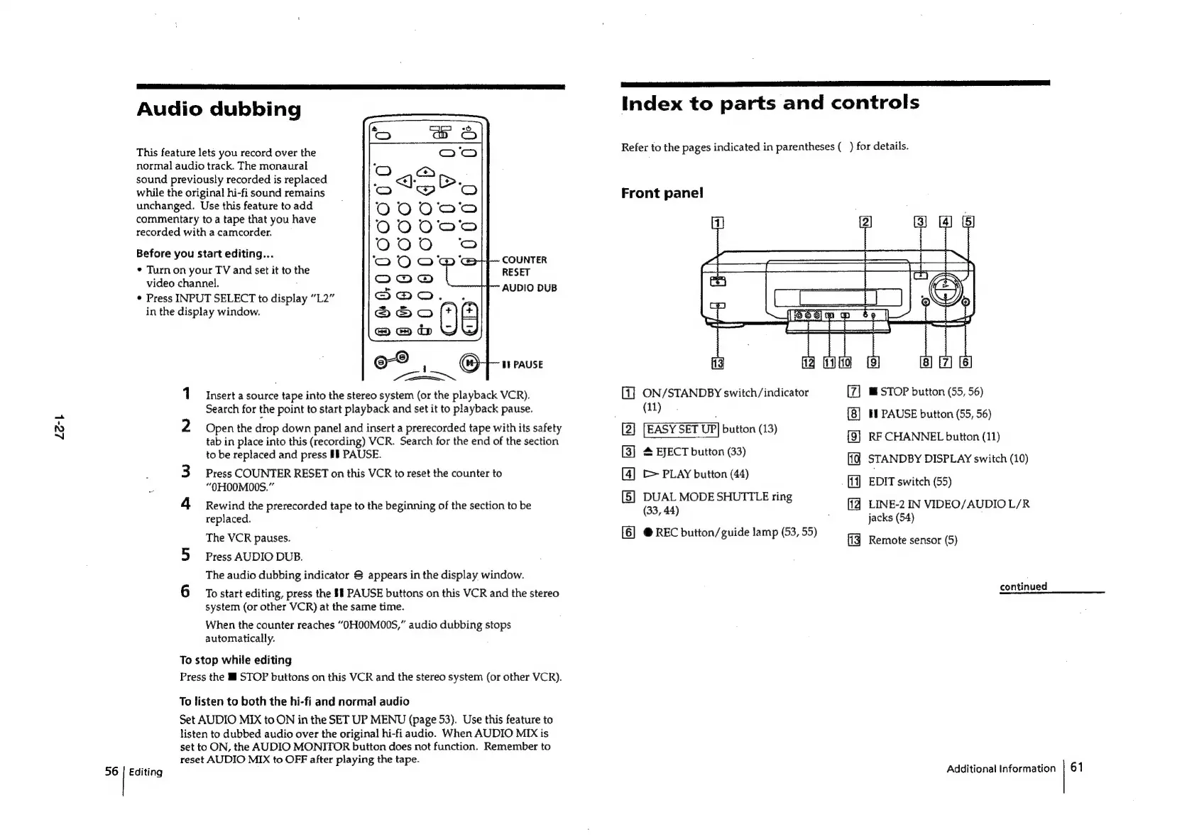 Sony SLV-E811NP - Audio Dubbing; Index to Parts and Controls; Front Panel