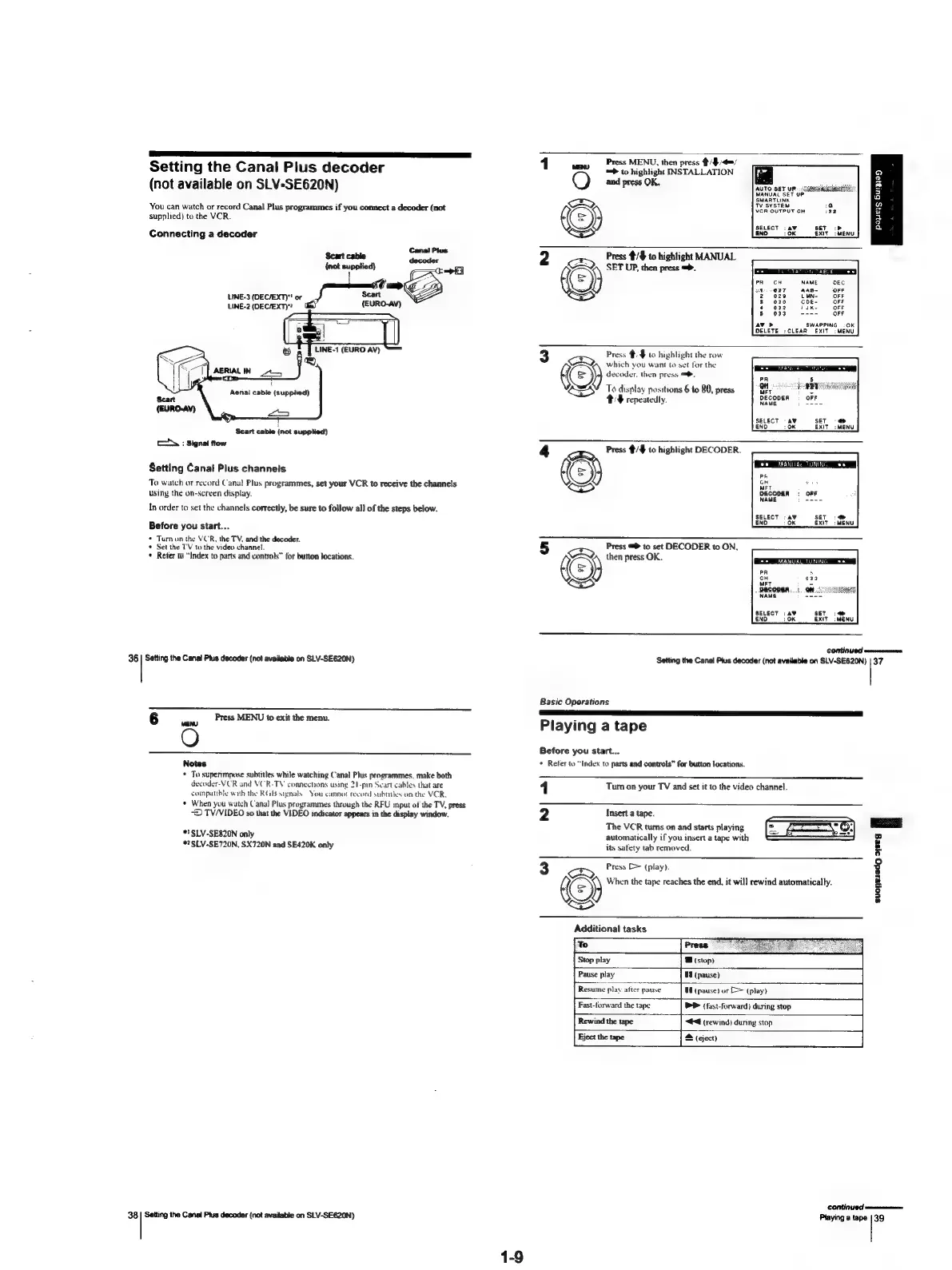 Sony SLV-SE620 - Setting the Canal Plus decoder; Basic Operations; Playing a tape
