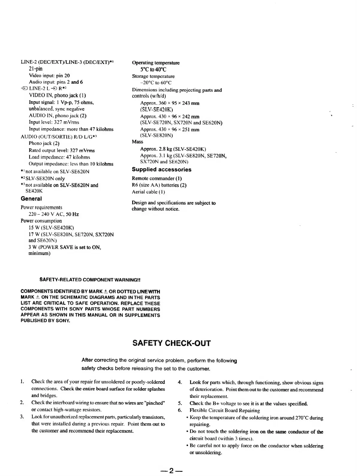 Sony SLV-SE727 - General Information; Safety Warnings and Checks; VCR Specifications