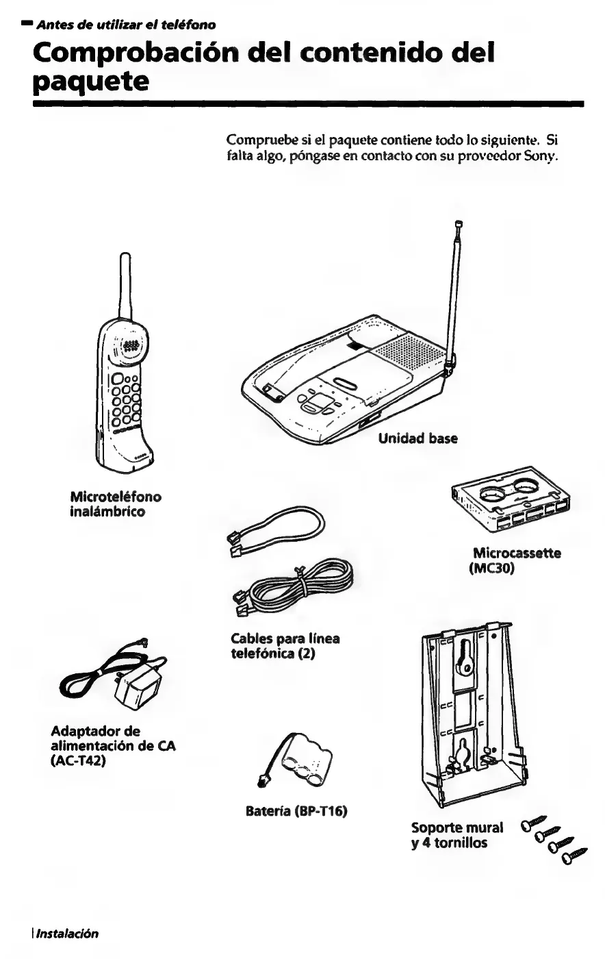 Sony SPP-A250 - Antes de Utilizar el Teléfono; Comprobacién del Contenido del Paquete
