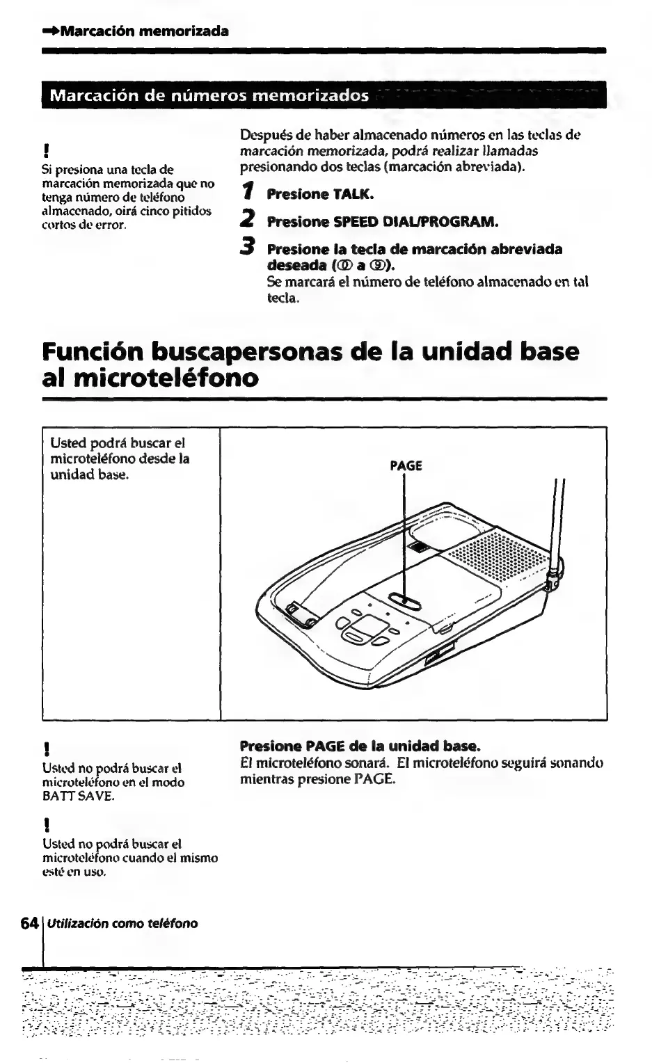 Sony SPP-A250 - Funcion Buscapersonas de la Unidad Base al Microteléfono; Marcacion de Numeros Memorizados