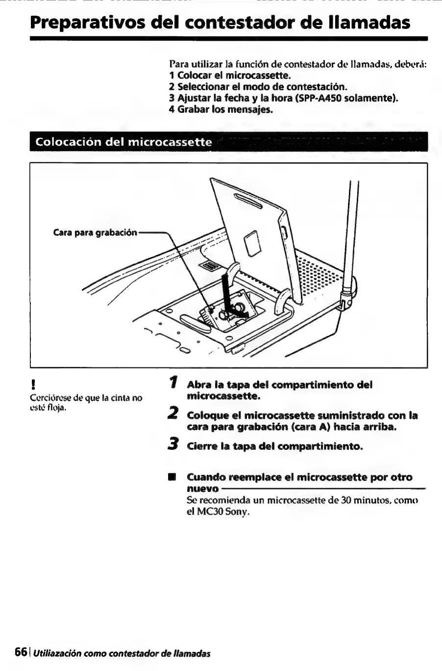 Sony SPP-A250 - Ajuste de la Fecha y la Hora (SPP-A450 Solamente); Colocacién del Microcassette; Preparativos del Contestador de Llamadas; Seleccién del Modo de Contestacién