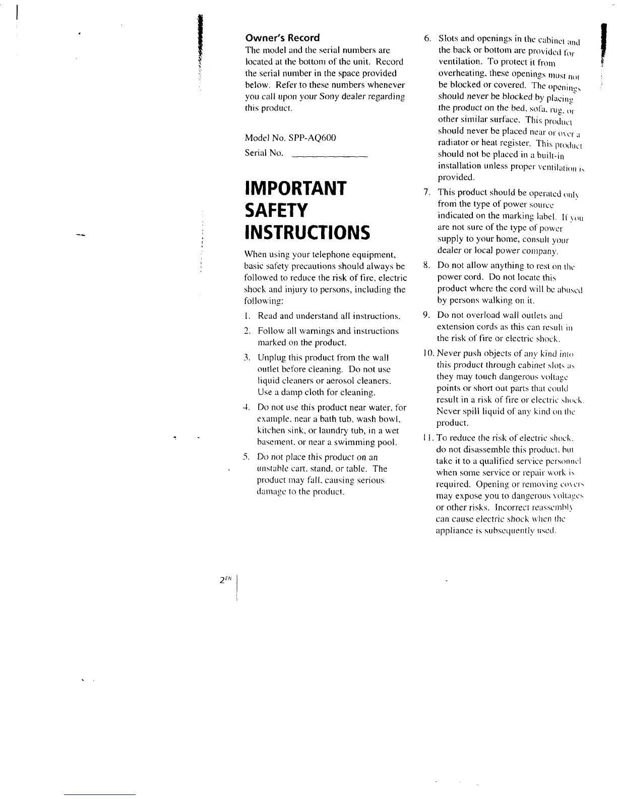 Sony SPP-AQ600 - Important Safety Instructions