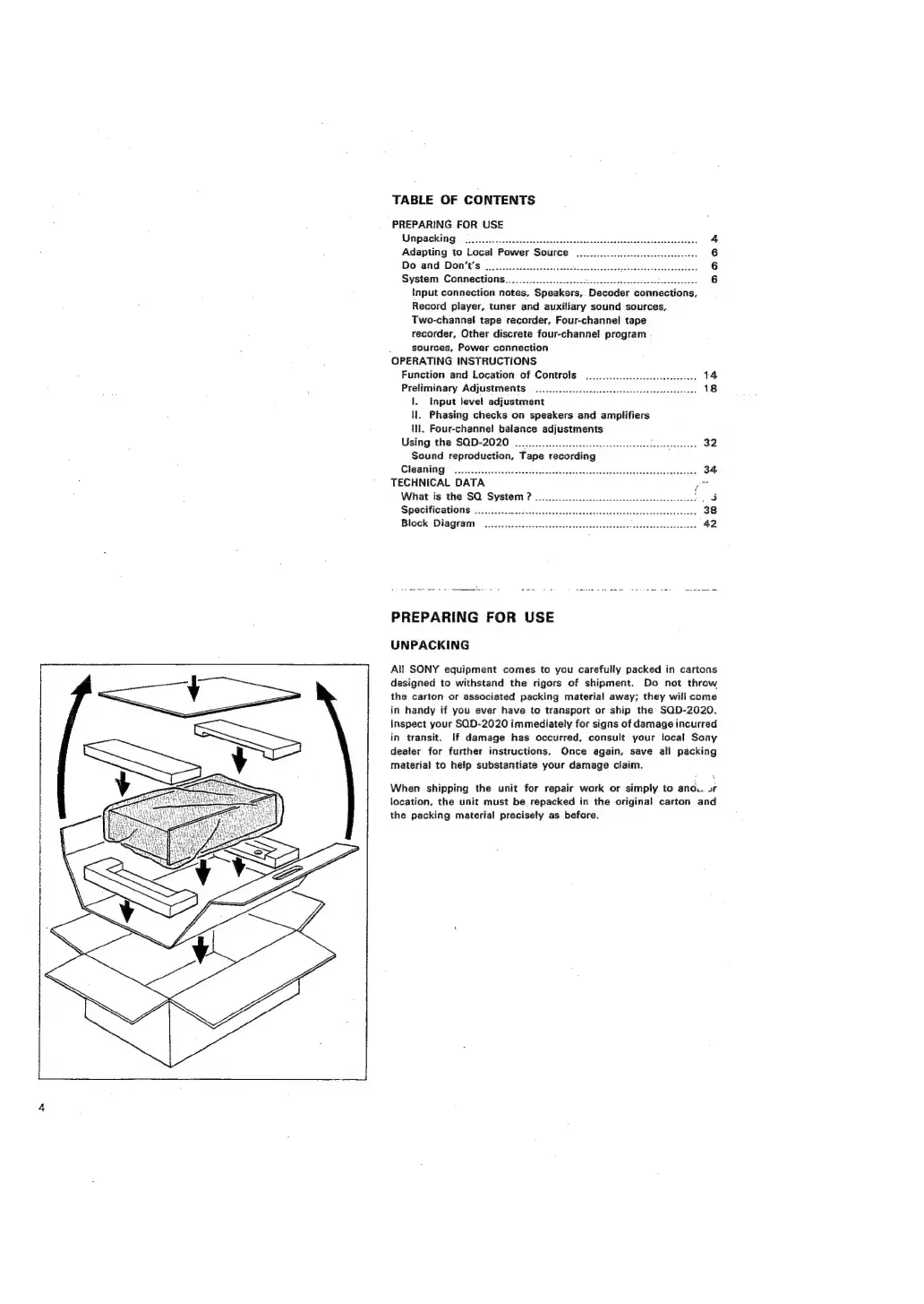 Sony SQD-2020 - PREPARING FOR USE; UNPACKING