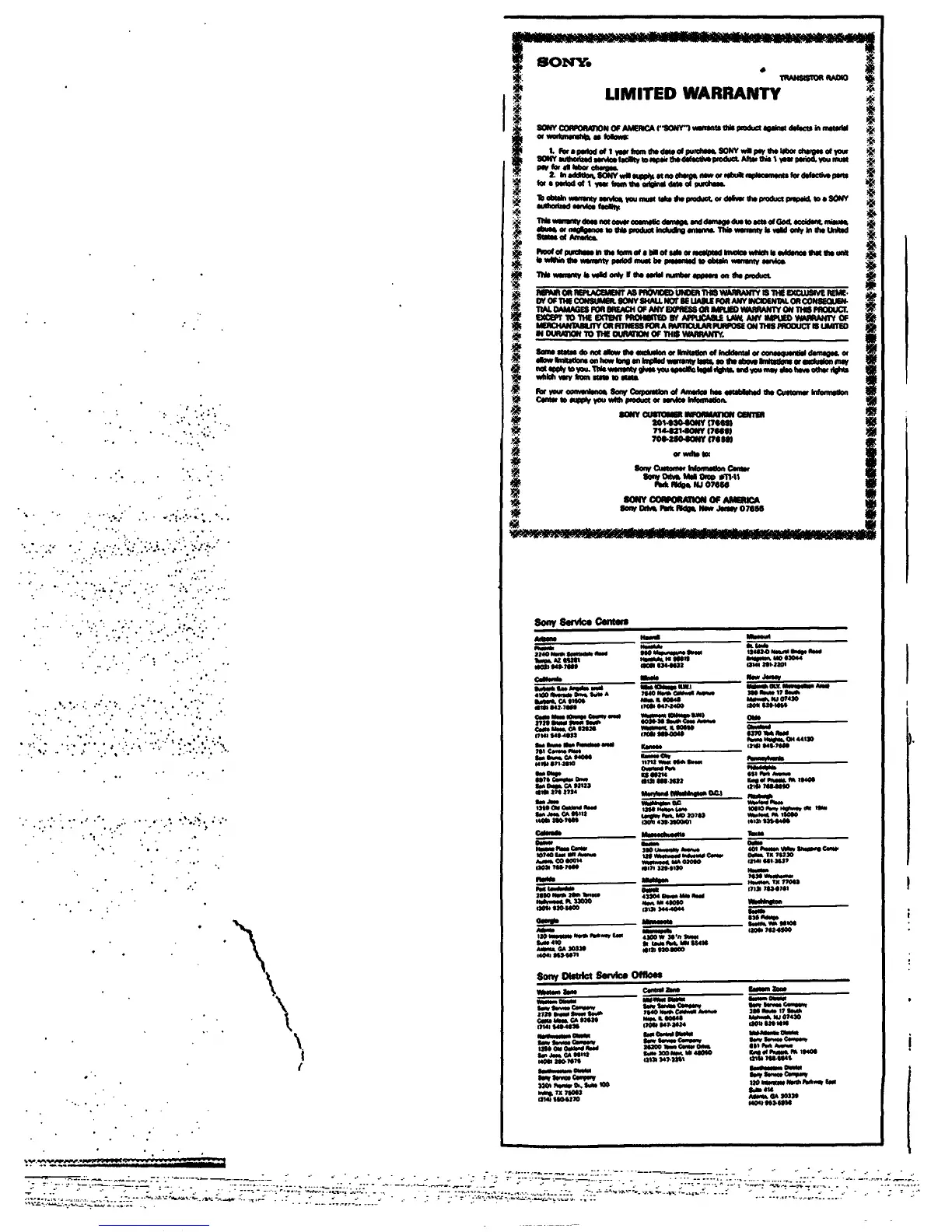 Sony SRF-85 - Limited Warranty; Warranty Coverage and Service; Obtaining Warranty Service; Customer Information and Service Locations