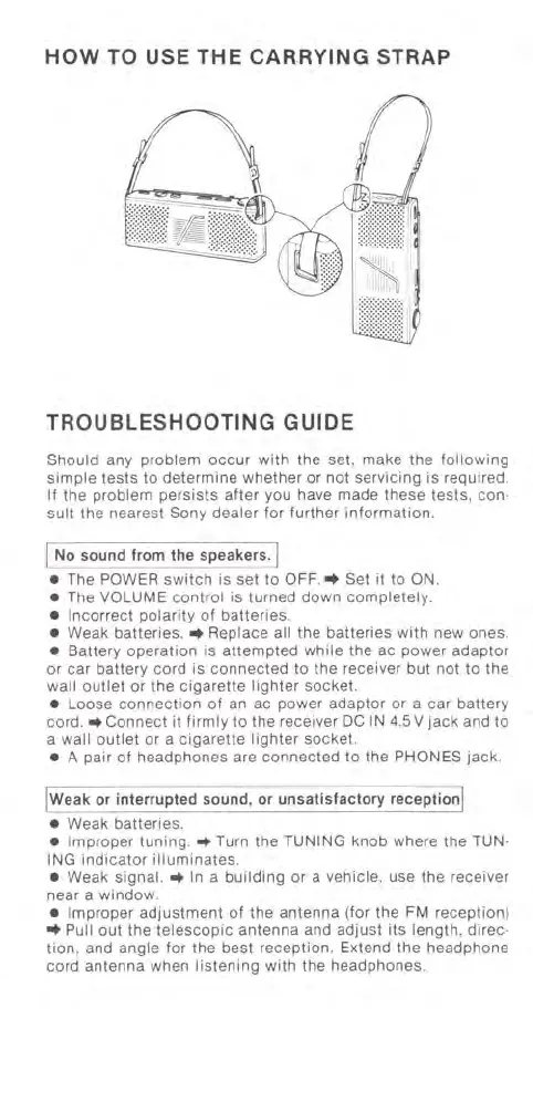 Sony SRF-A100 - CARRYING STRAP INSTRUCTIONS; TROUBLESHOOTING GUIDE