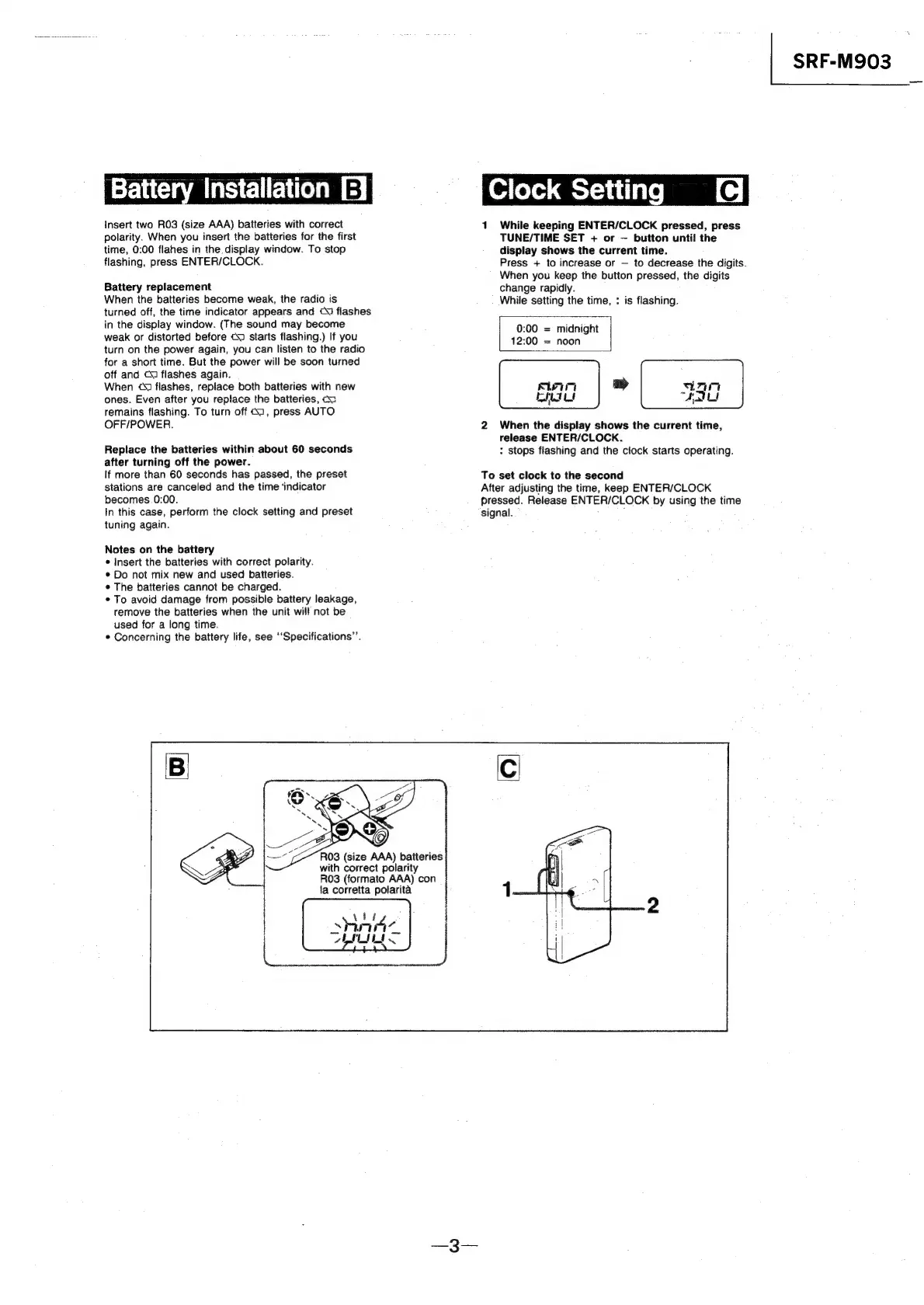 Sony SRF-M903 - Clock Setting; Battery Replacement