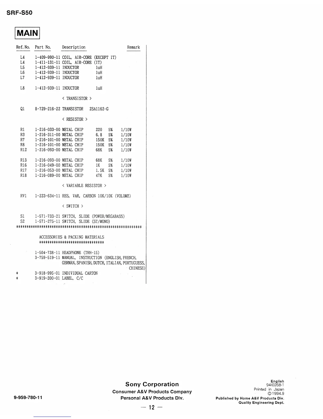 Sony SRF-S50 - Section 6 Continued: Additional Parts