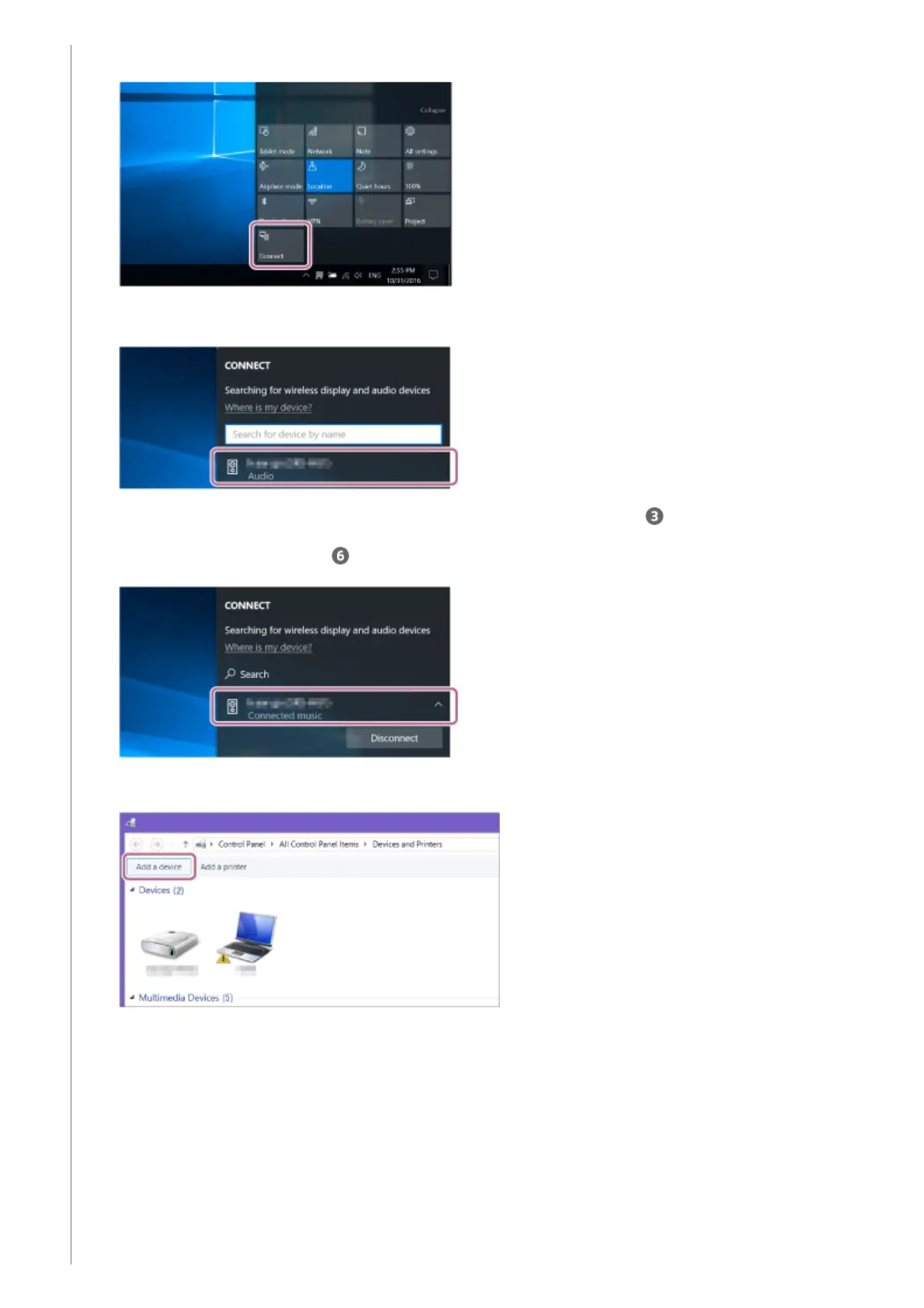 Select [Connect] in the Action Center on the right-bottom of the screen. 1.