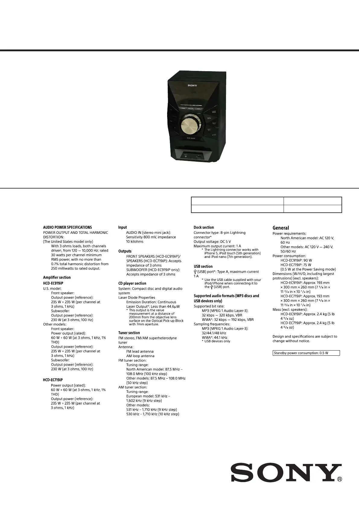 Sony SS-EC719iP - System Specifications and Model Identification; Model Identification and Regional Variants; Audio Power Specifications; Technical Specifications Overview