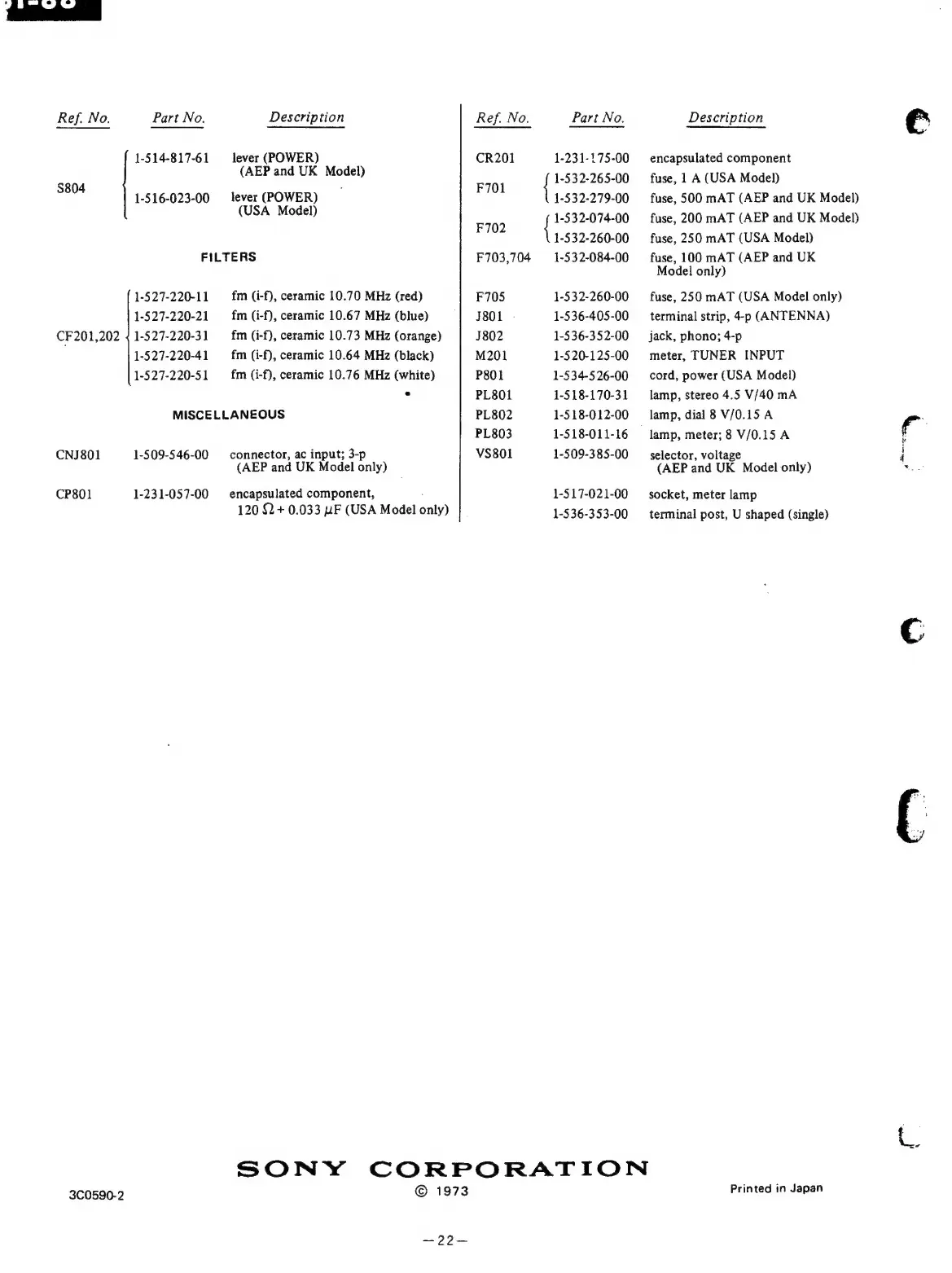 Sony ST-88 - Electrical Parts List: Filters and Miscellaneous; Filters and Miscellaneous Parts Listing
